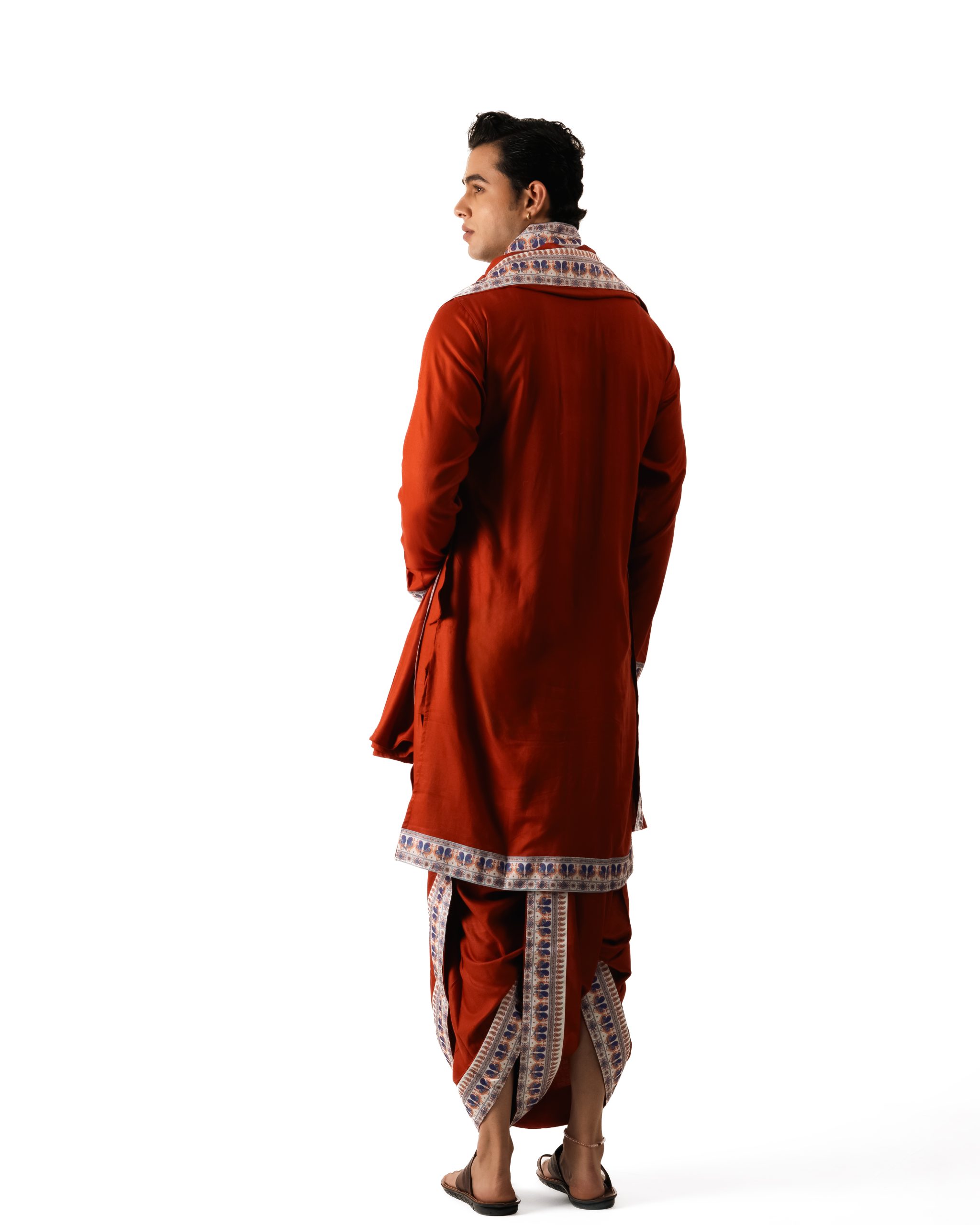 The Aarambh Set draws from India’s earthy elegance — crafted in soft Bagalpuri rayon with a fluid drape and subtle sheen. The dhoti and bagalbandhi feature an artisanal white border where twin peacocks mirror each other, symbolizing beauty and union. Designed for ease and movement, it’s perfect for festive gatherings, cultural wear, or statement everyday dressing.