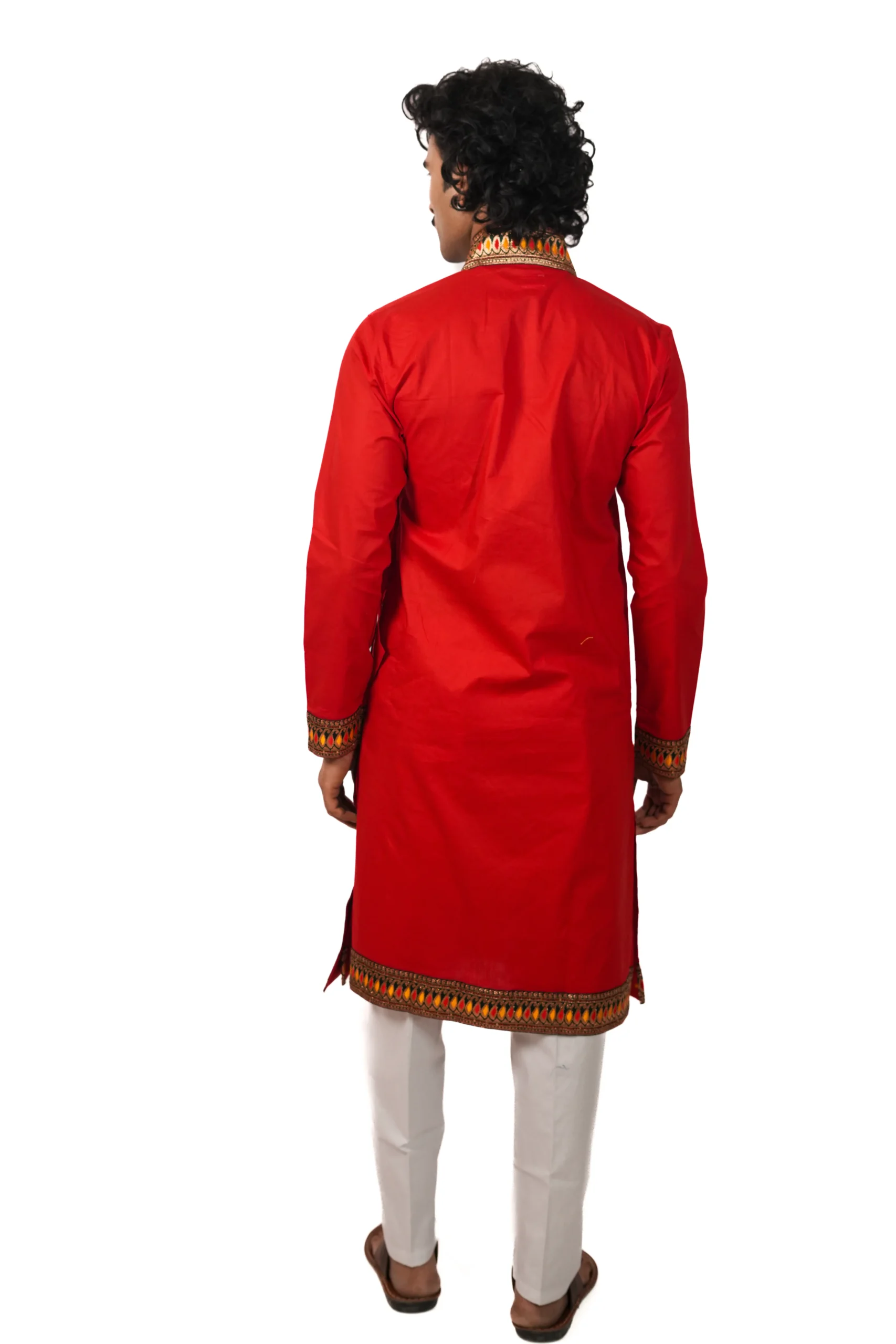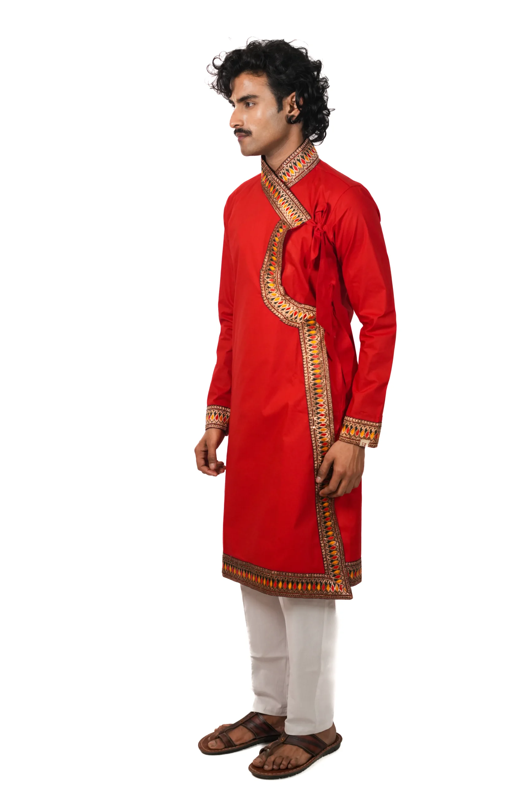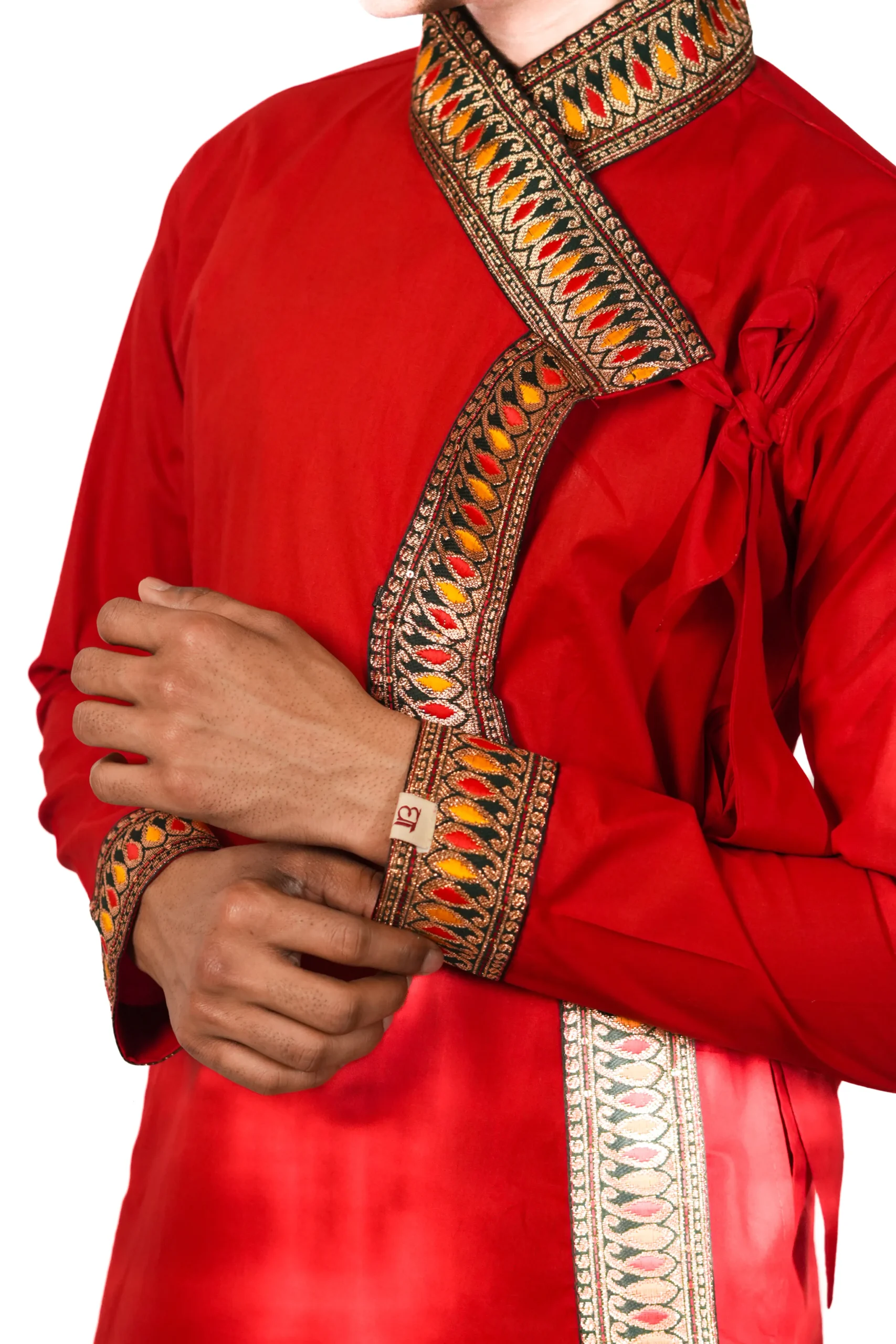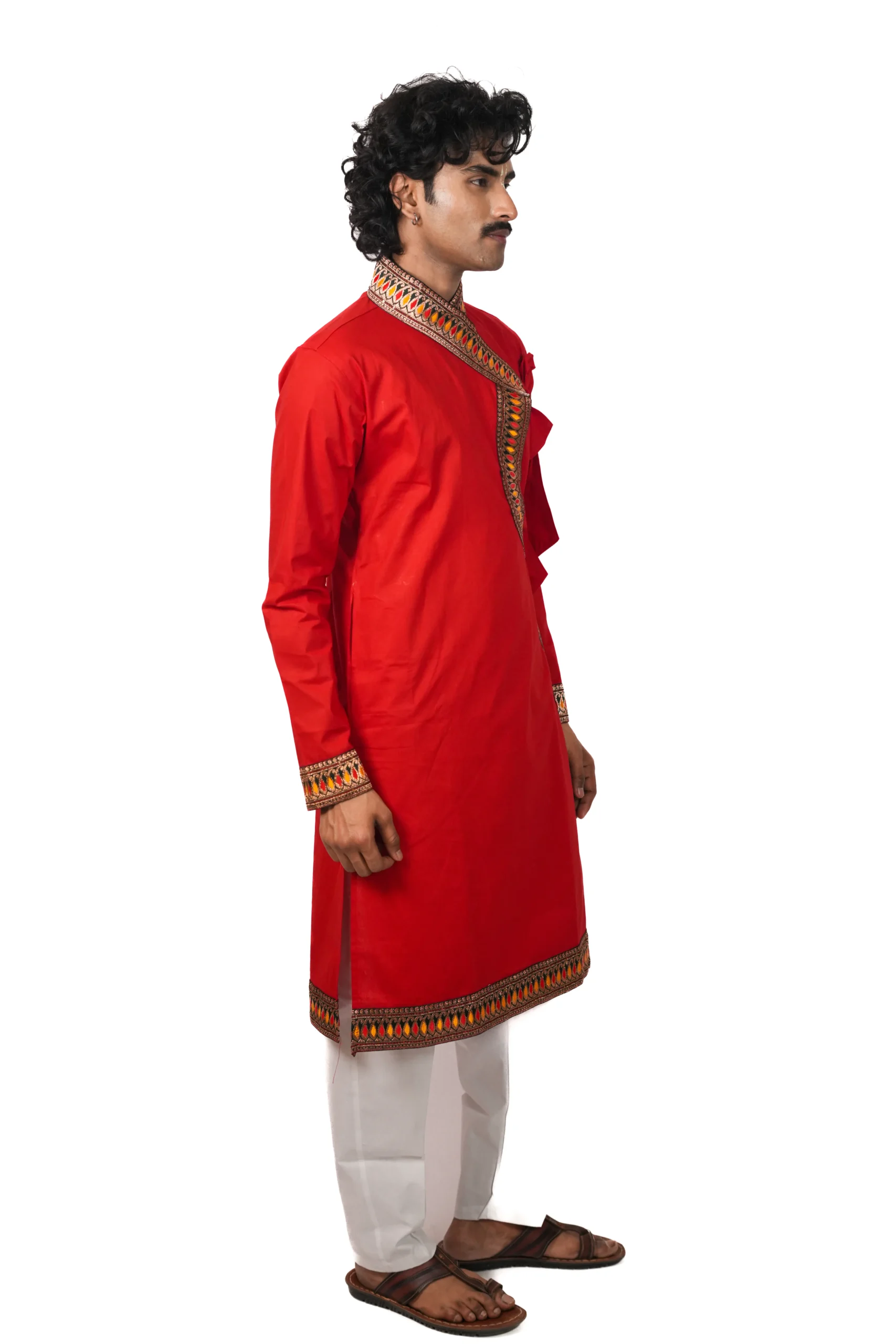 कॉटन बागलबंधी, जिसमें आकर्षक बॉर्डर डिटेलिंग की गई है। यह आराम और उत्सव दोनों के लिए उपयुक्त है।