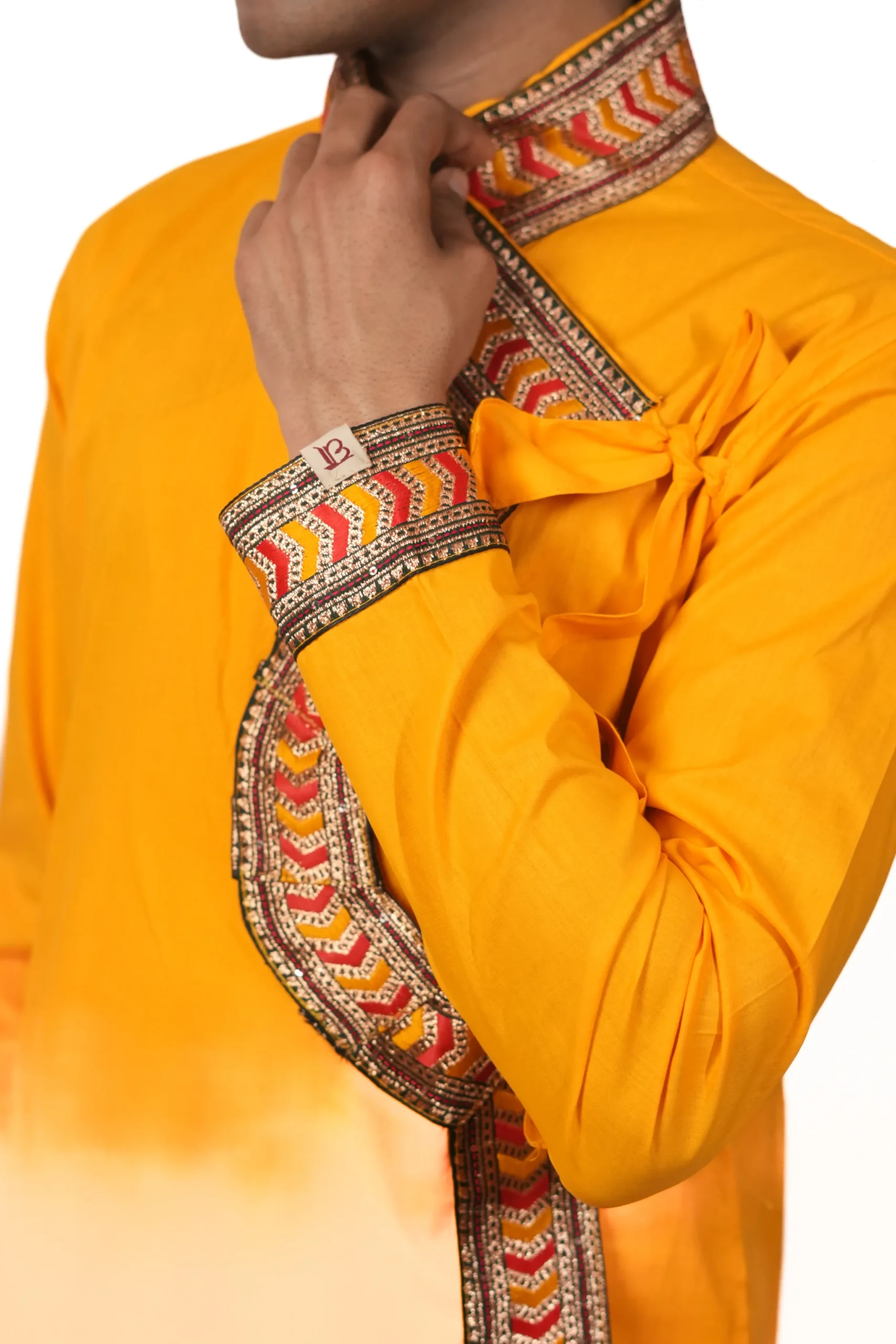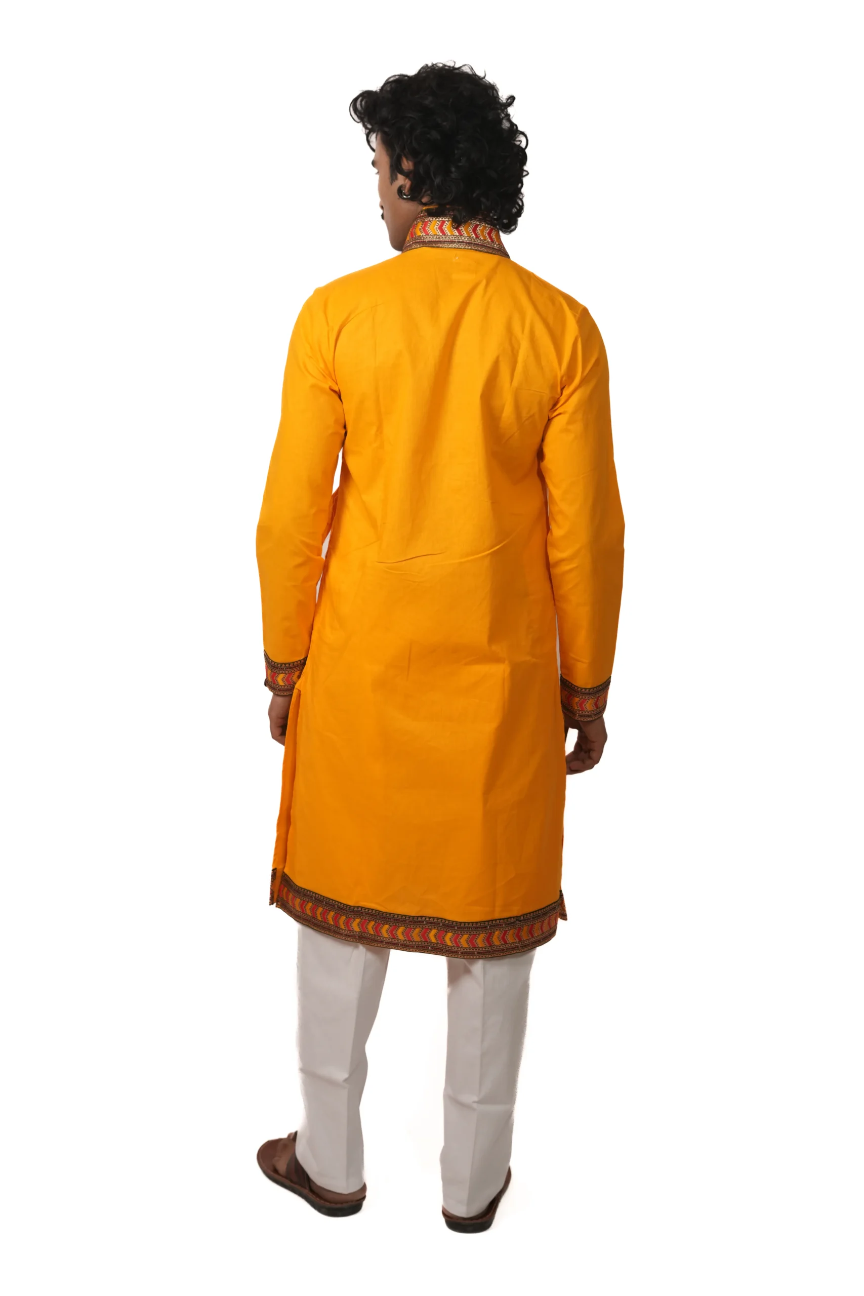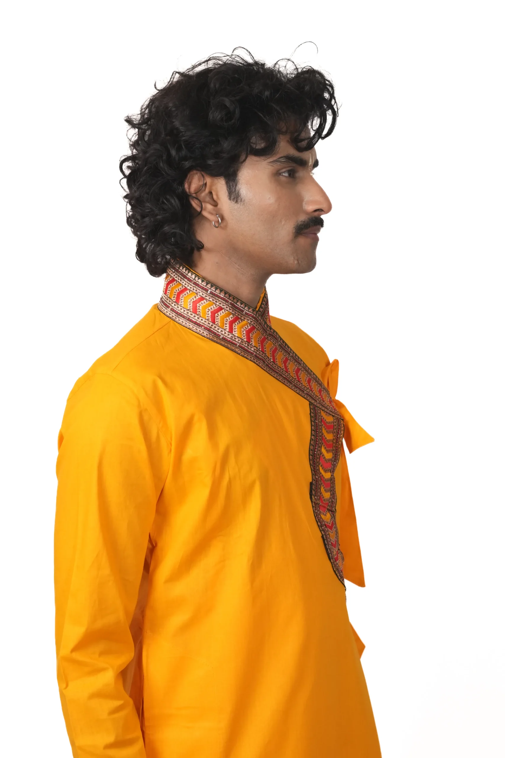 The Cotton Border Bagalbandhi is crafted from breathable cotton, offering comfort and ease for extended wear. The design is highlighted with bold woven border detailing along the neckline, cuffs, and front panel, adding a festive character to the garment. The classic bagalbandhi silhouette ensures a relaxed and balanced fit. Ideal for festive gatherings, temple visits, and traditional occasions, this piece reflects Dharniya’s approach to combining comfort with cultural aesthetics.
