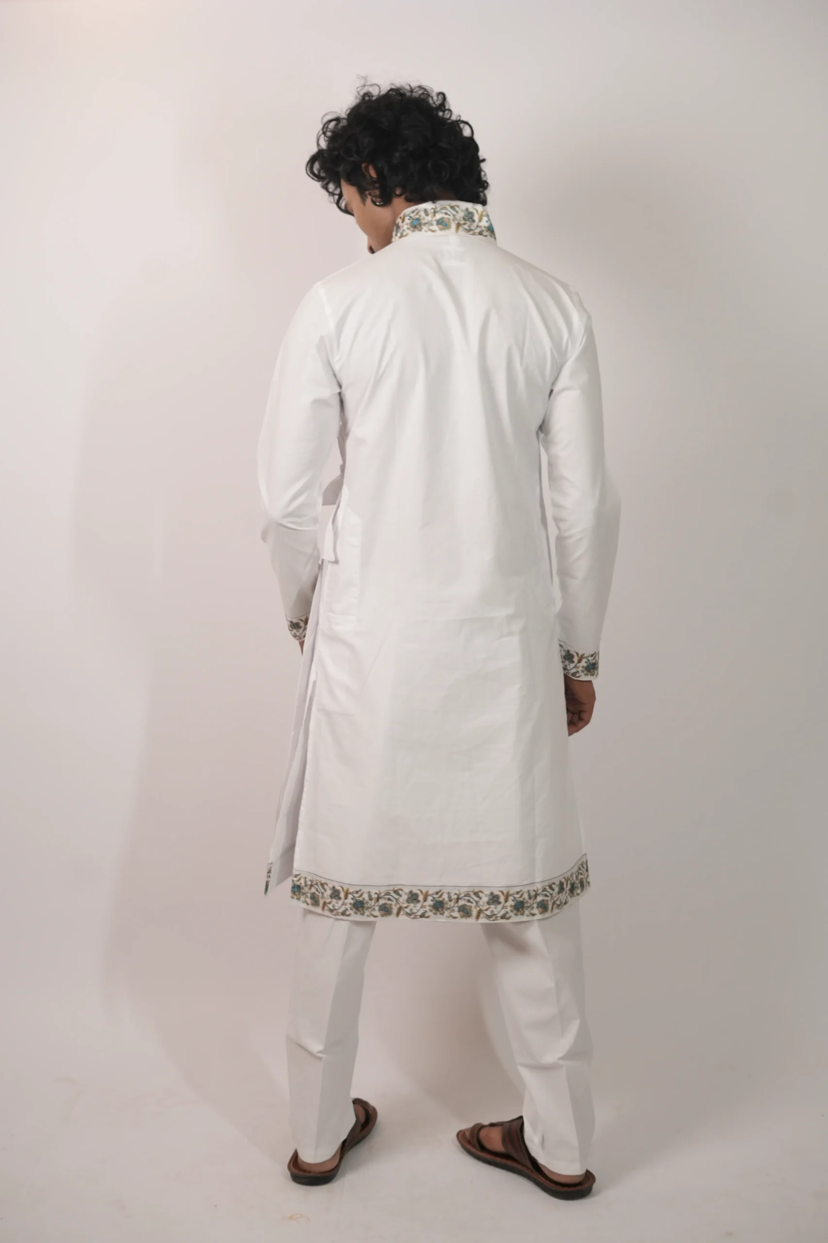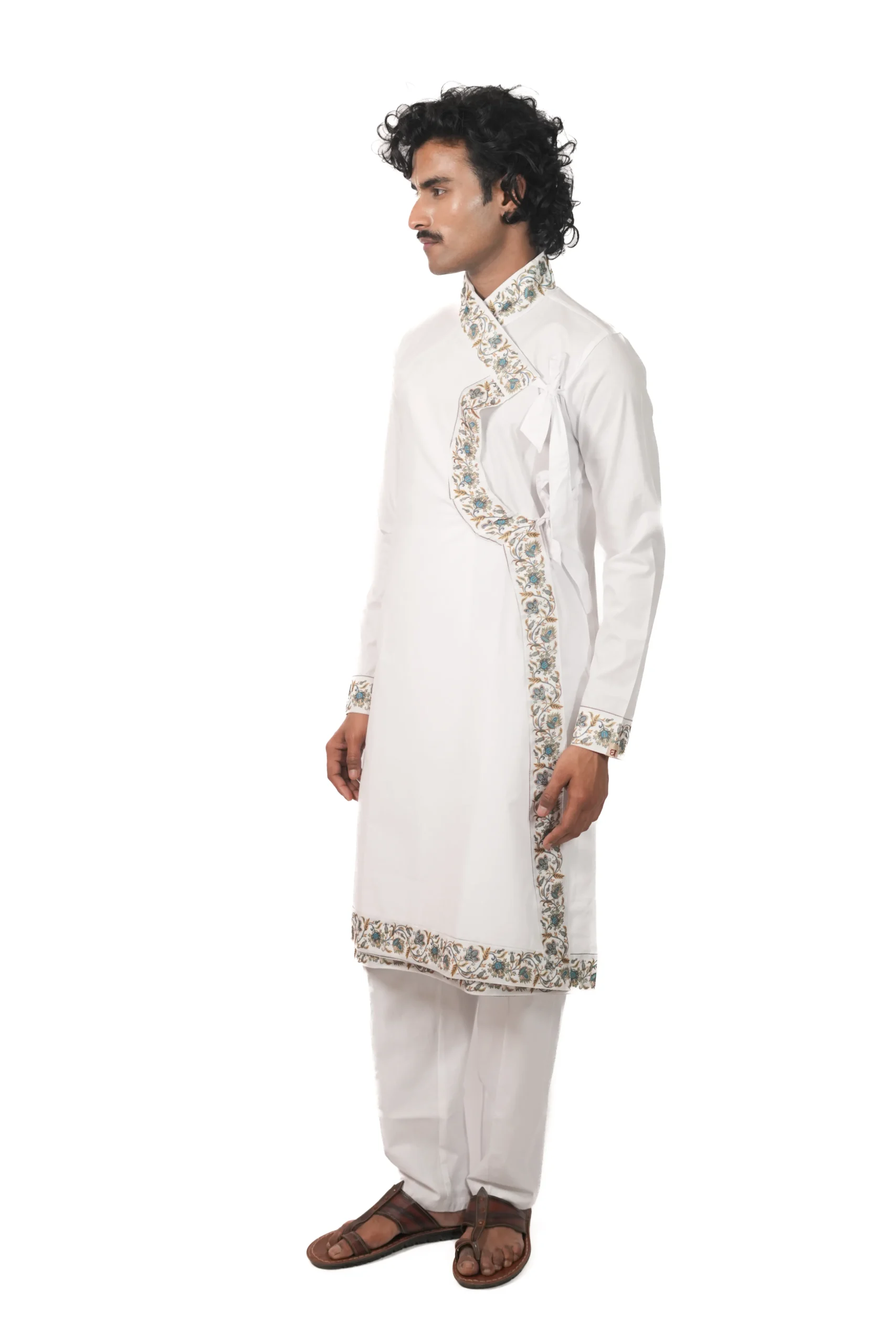 कॉटन बागलबंधी, जिसमें आकर्षक बॉर्डर डिटेलिंग की गई है। यह आराम और उत्सव दोनों के लिए उपयुक्त है।
