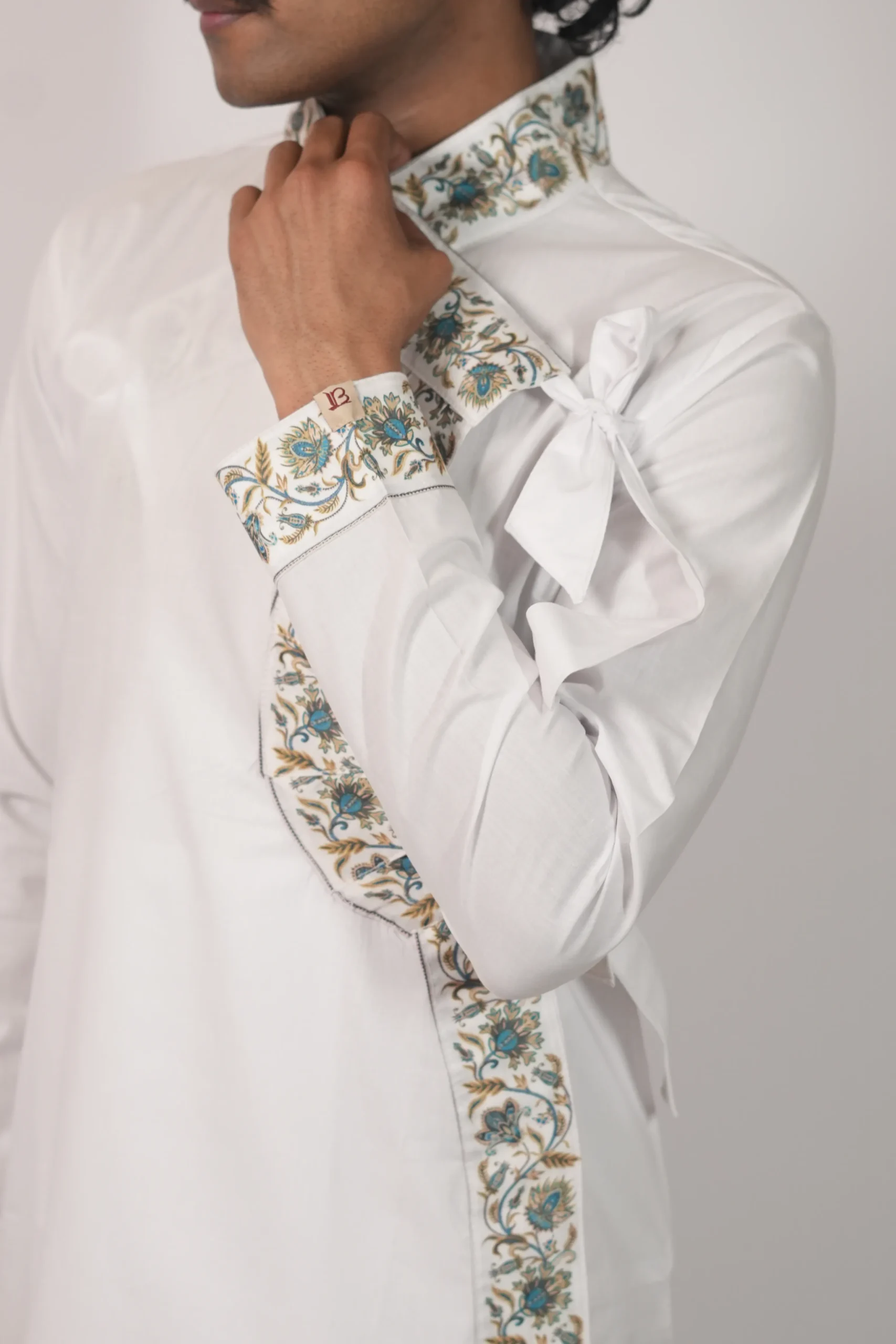 The Cotton Border Bagalbandhi is crafted from breathable cotton, offering comfort and ease for extended wear. The design is highlighted with bold woven border detailing along the neckline, cuffs, and front panel, adding a festive character to the garment. The classic bagalbandhi silhouette ensures a relaxed and balanced fit. Ideal for festive gatherings, temple visits, and traditional occasions, this piece reflects Dharniya’s approach to combining comfort with cultural aesthetics.