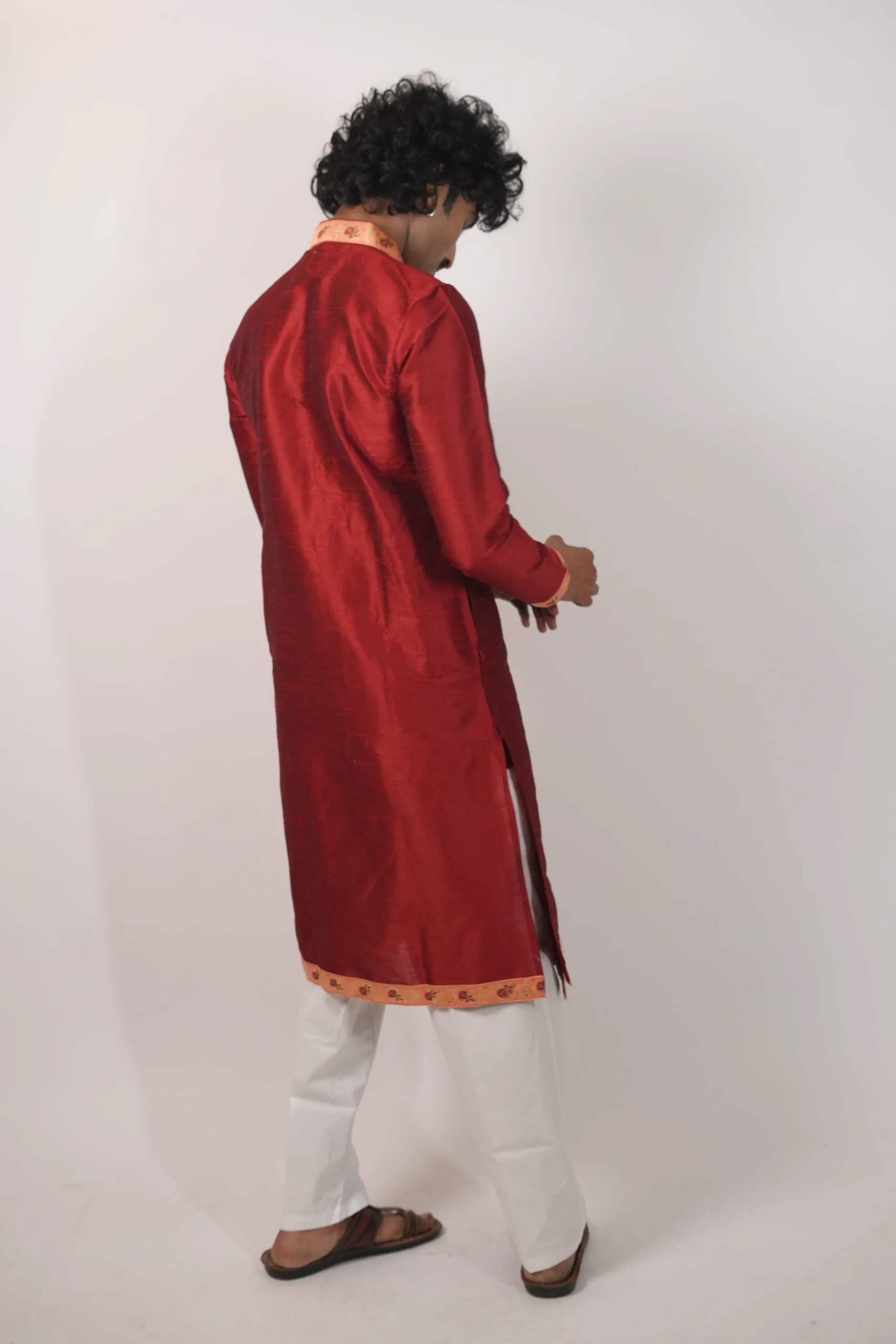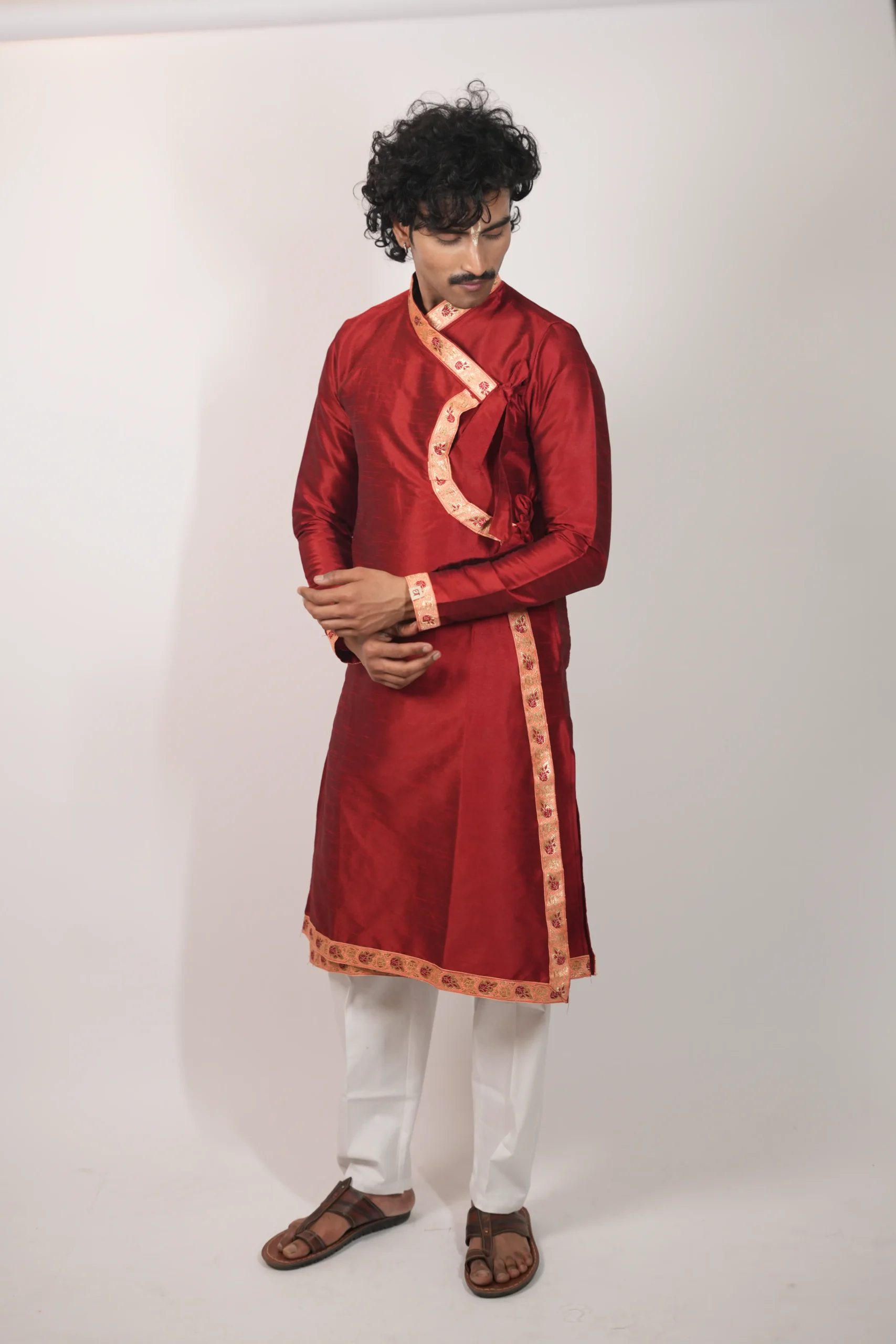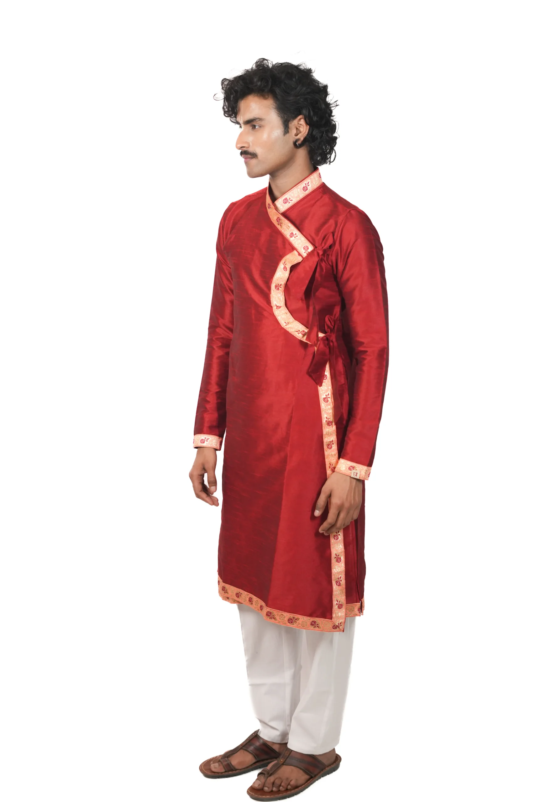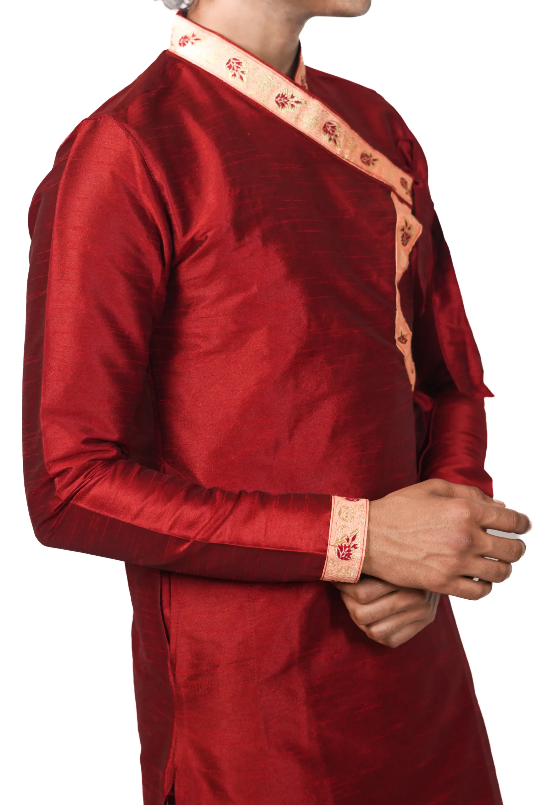 The Dupion Border Bagalbandhi is crafted in rich dupion silk, offering a structured feel with a subtle sheen. The design is enhanced with detailed border work along the neckline, cuffs, and hem, adding a refined festive character. The deep red tone brings a strong and elegant presence, making it ideal for weddings and traditional celebrations. The classic bagalbandhi silhouette ensures a comfortable and balanced fit. This piece reflects Dharniya’s focus on refined, wearable craftsmanship