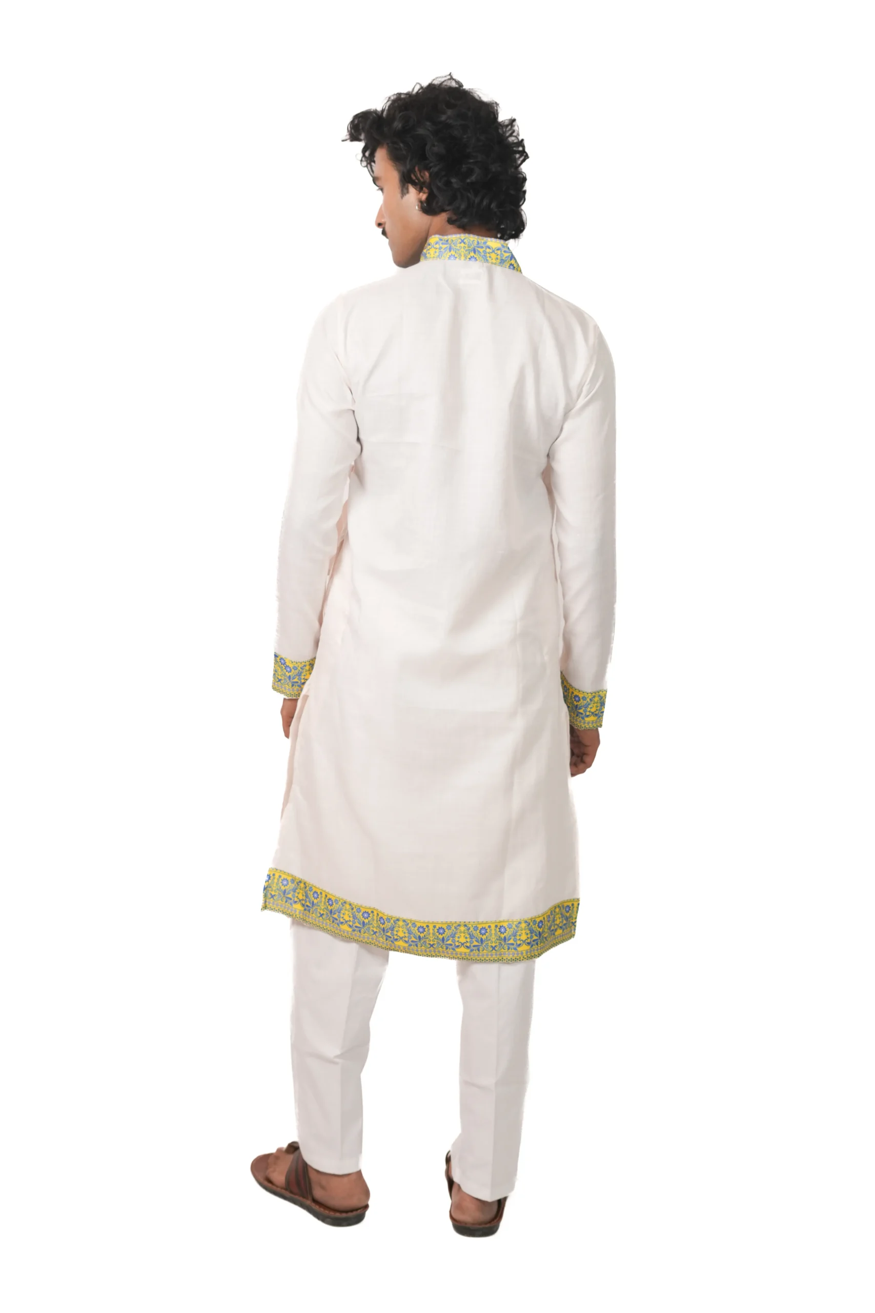 The Cotton Border Bagalbandhi is crafted in an airy cotton weave, offering comfort and ease for all-day wear. This variant features a finely printed border integrated into the fabric, giving it a clean and seamless look. The white base paired with blue-toned detailing creates a calm and balanced aesthetic, making it ideal for temple visits, small gatherings, and traditional occasions. The classic bagalbandhi silhouette ensures a relaxed and natural fit. This piece reflects धारणिया’s approach of combining simplicity with thoughtful detailing.