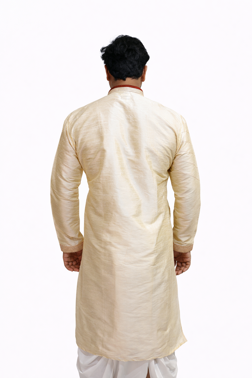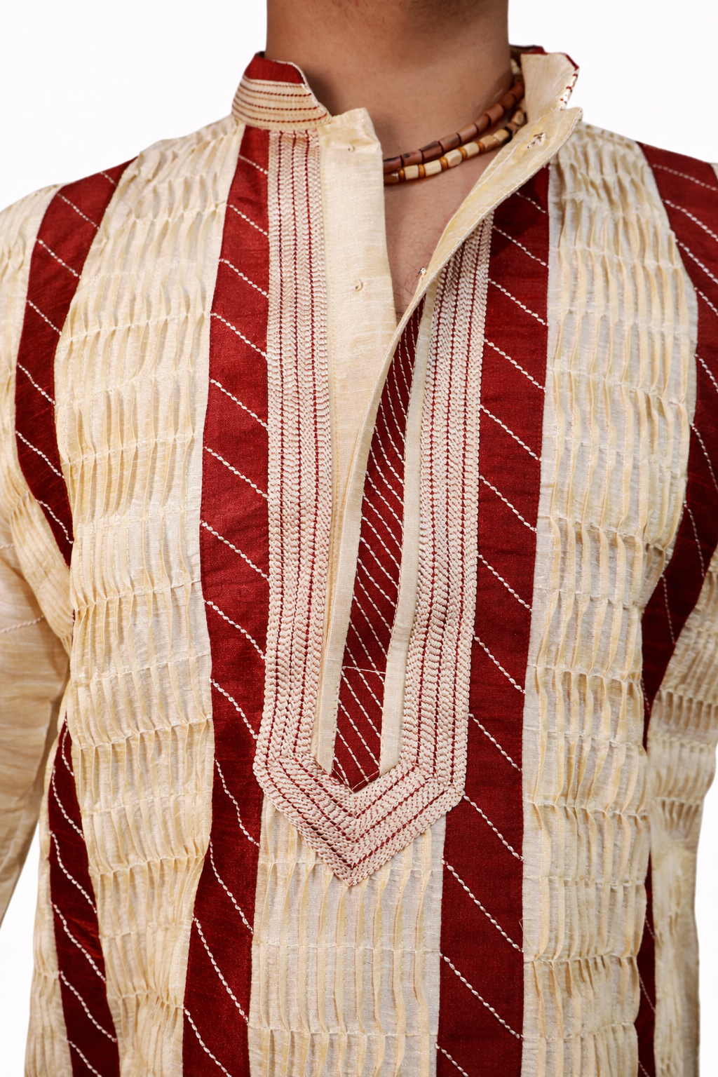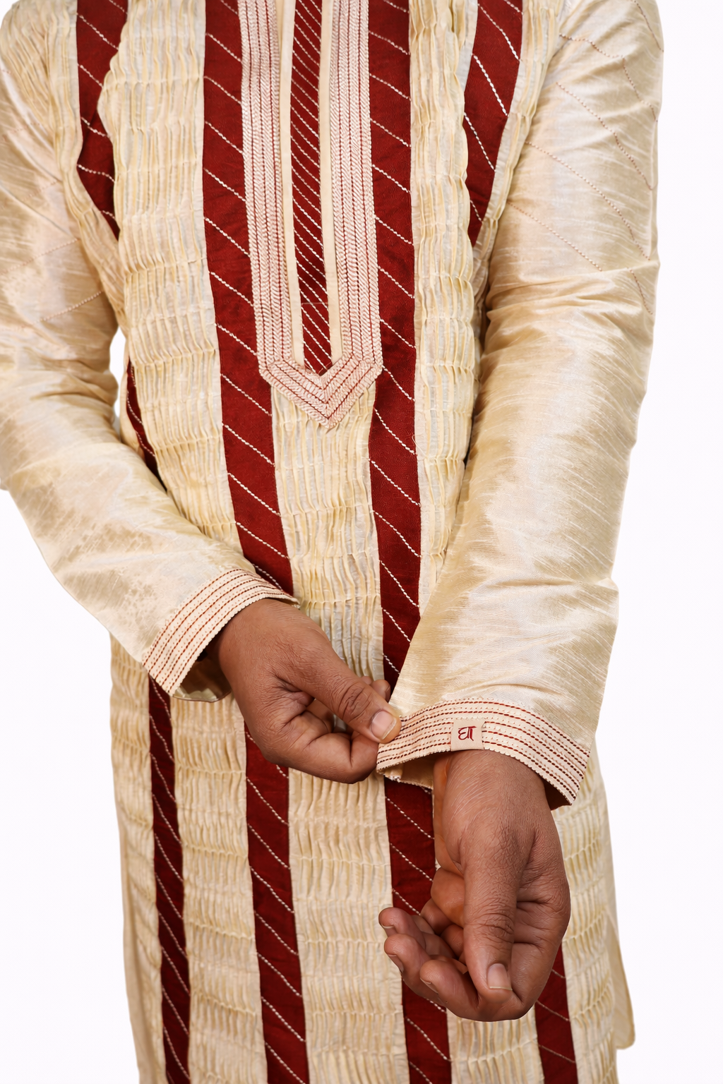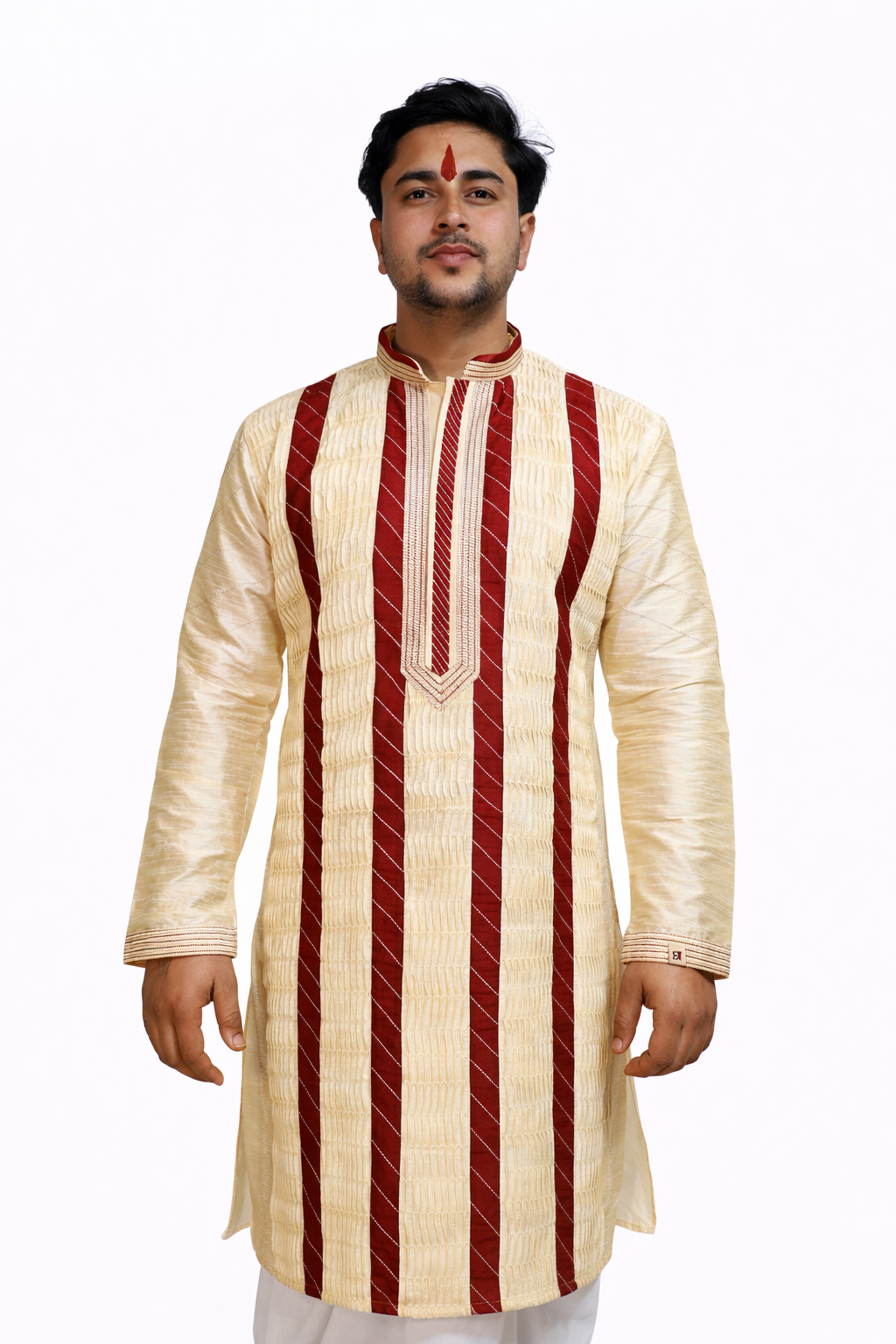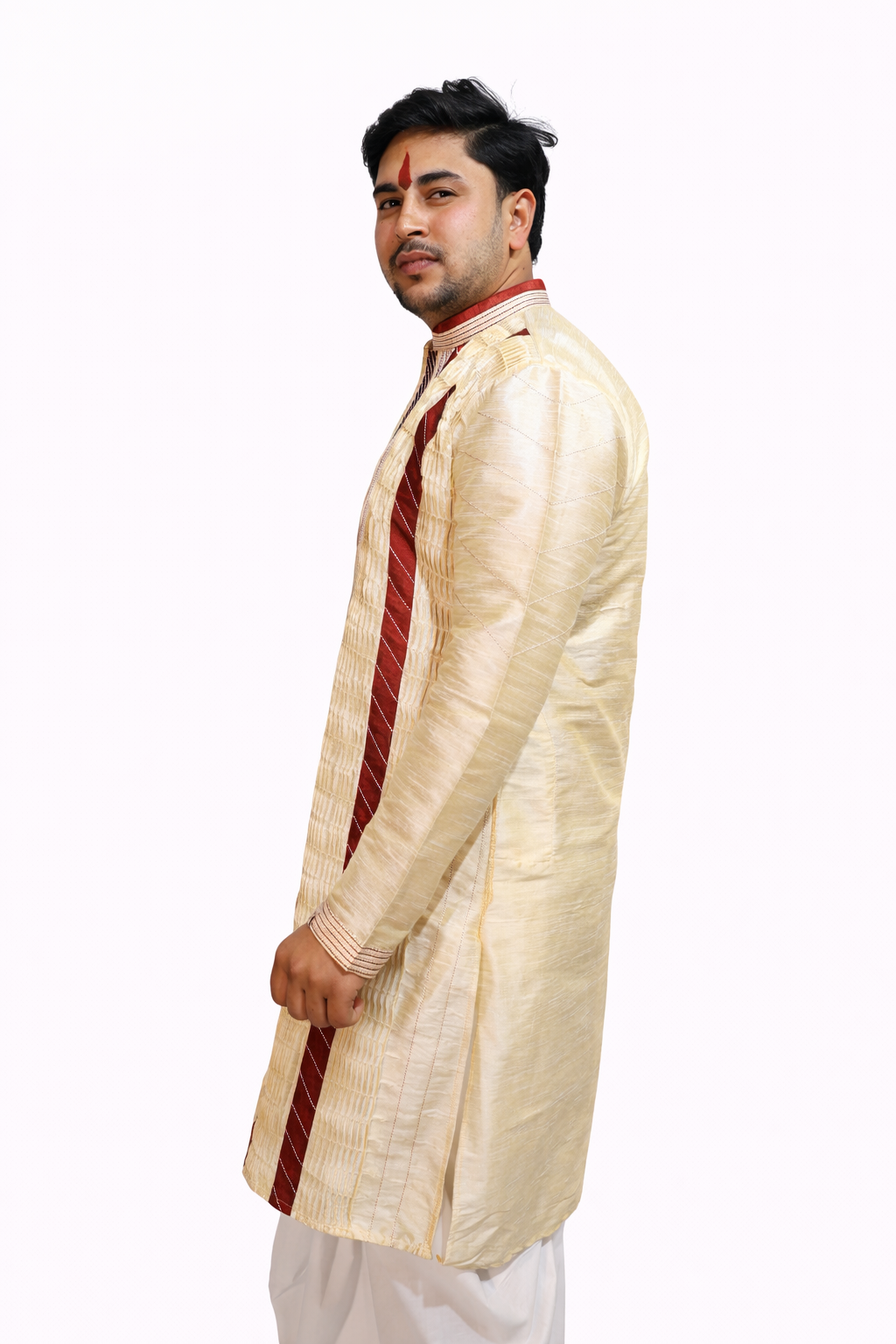 The Rajbari Wedding Kurta is crafted in a textured silk blend that offers structure and a subtle sheen. Inspired by traditional Calcutta panel designs, the kurta features contrast vertical detailing and refined thread work along the neckline and sleeves. The placement enhances the silhouette, giving it a formal and regal presence. Designed for weddings, receptions, and ceremonial gatherings.