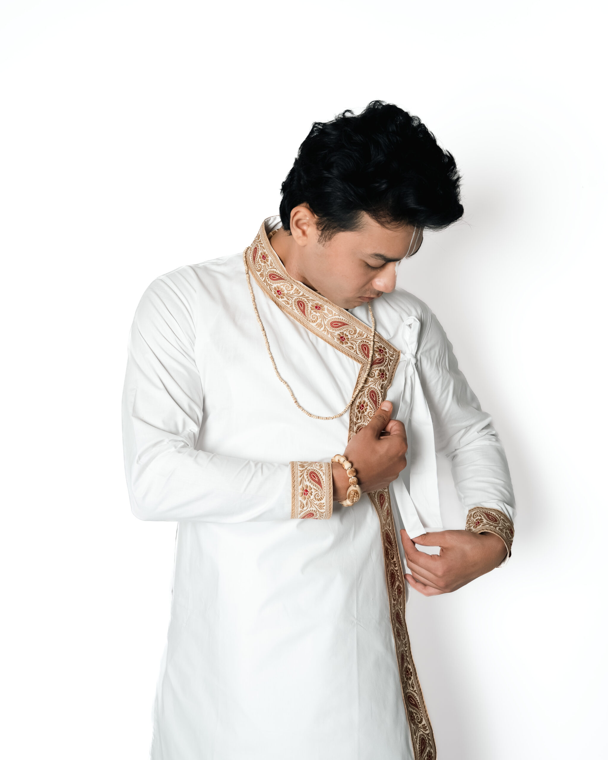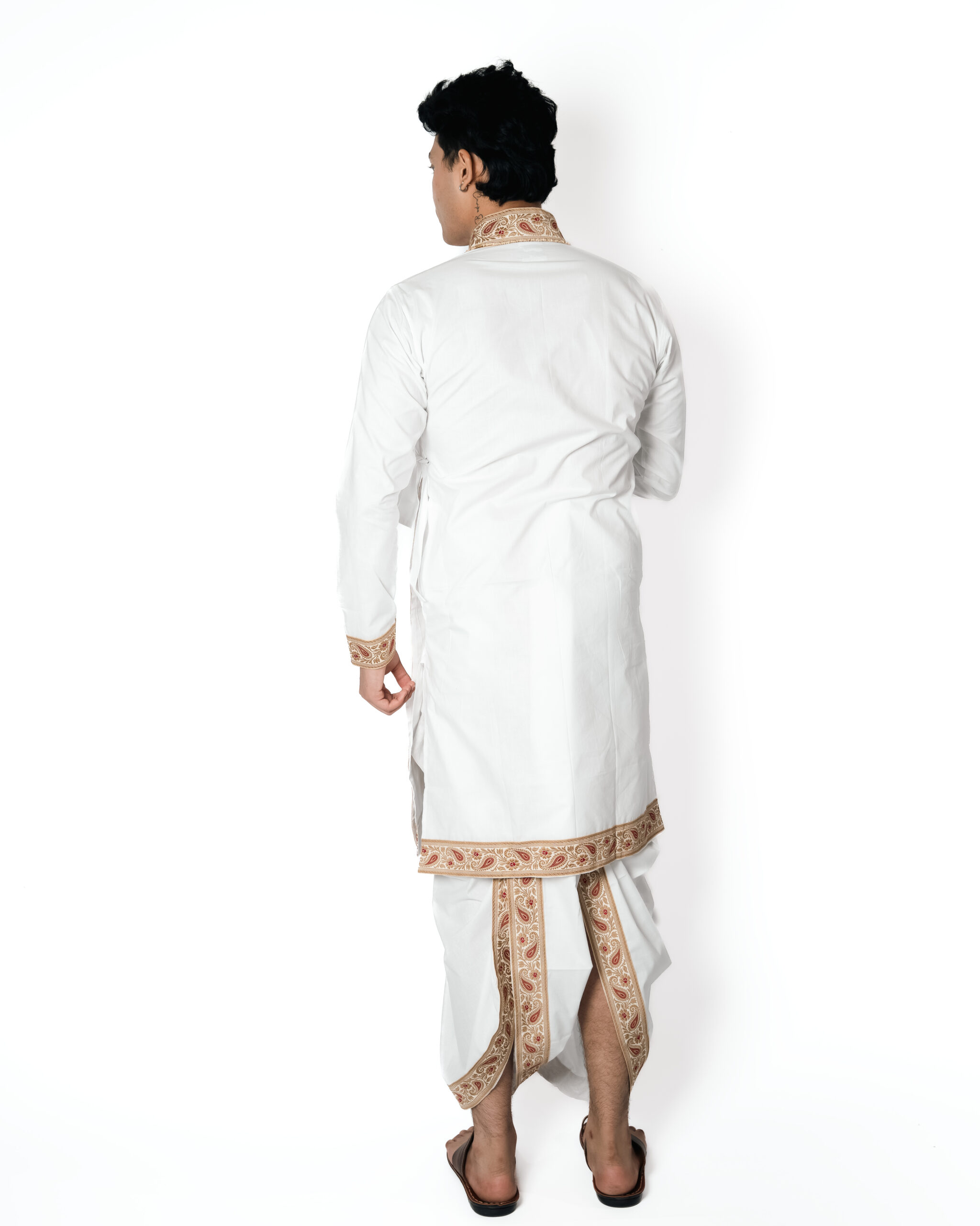 Includes: One Bagalbandhi, One Dhoti, and One Dupatta. कैरव सेट अपनी शुद्ध कॉटन बनावट और सुंदर कैरी बॉर्डर के साथ भारतीय परंपरा की सुंदरता को उजागर करता है। सफेद रंग पवित्रता का प्रतीक है, और कैरी की आकृति समृद्धि और निरंतरता का भाव लाती है। धोती, दुपट्टा और बागलबंधी का यह संयोजन न केवल आरामदायक है बल्कि हर पारंपरिक अवसर के लिए उपयुक्त भी। यह धरणिया की उस सोच का प्रतीक है जहाँ सादगी में ही सबसे गहरी सुंदरता छिपी है।