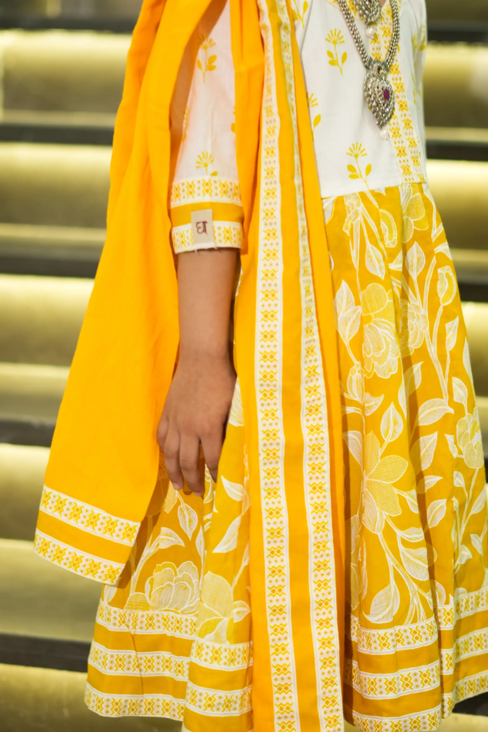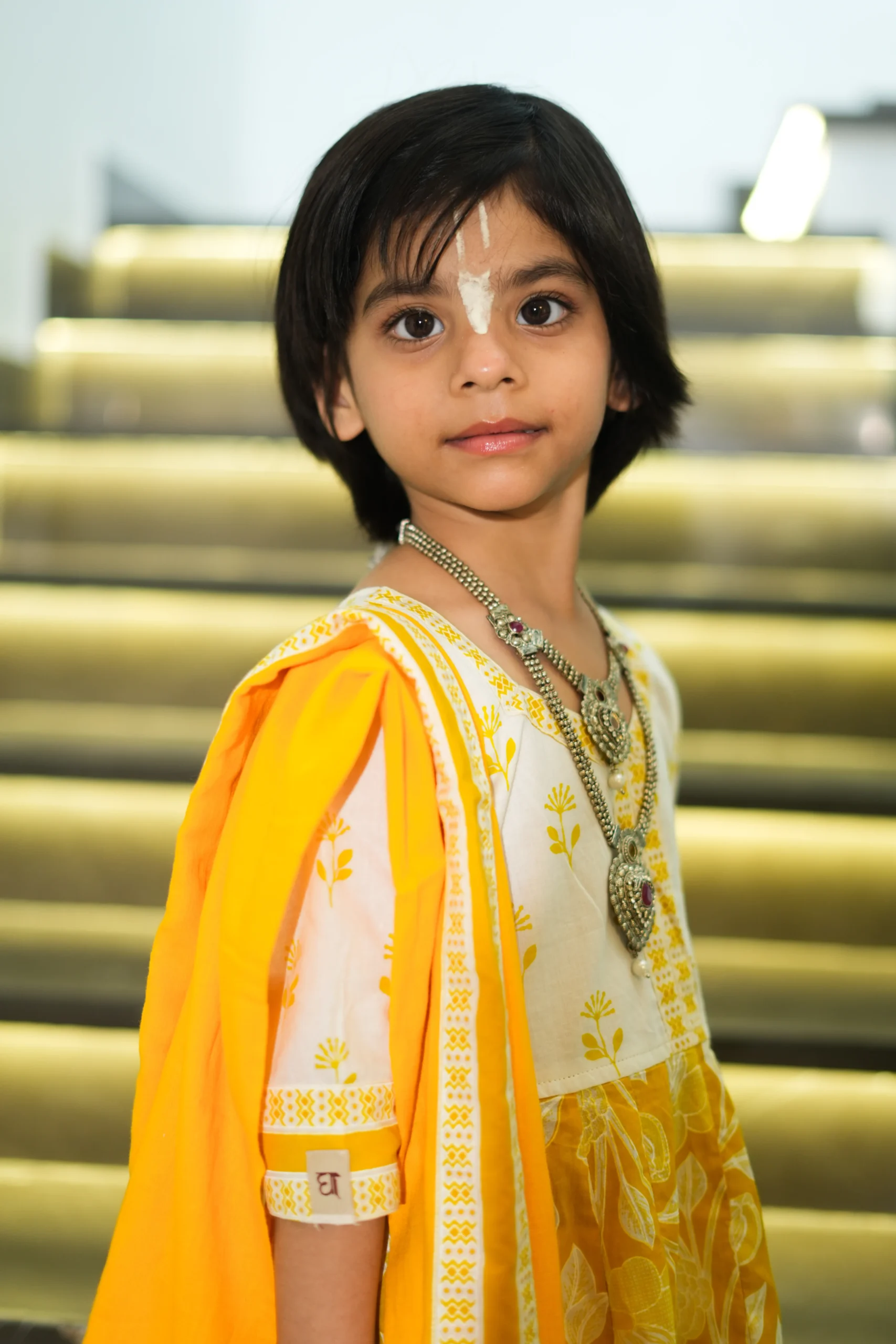 The Baal Raas Anarkali Set is crafted to bring together elegance and ease for young wearers. Featuring a flared Anarkali silhouette paired with comfortable leggings and a soft dupatta, this set creates a complete festive look while ensuring freedom of movement.