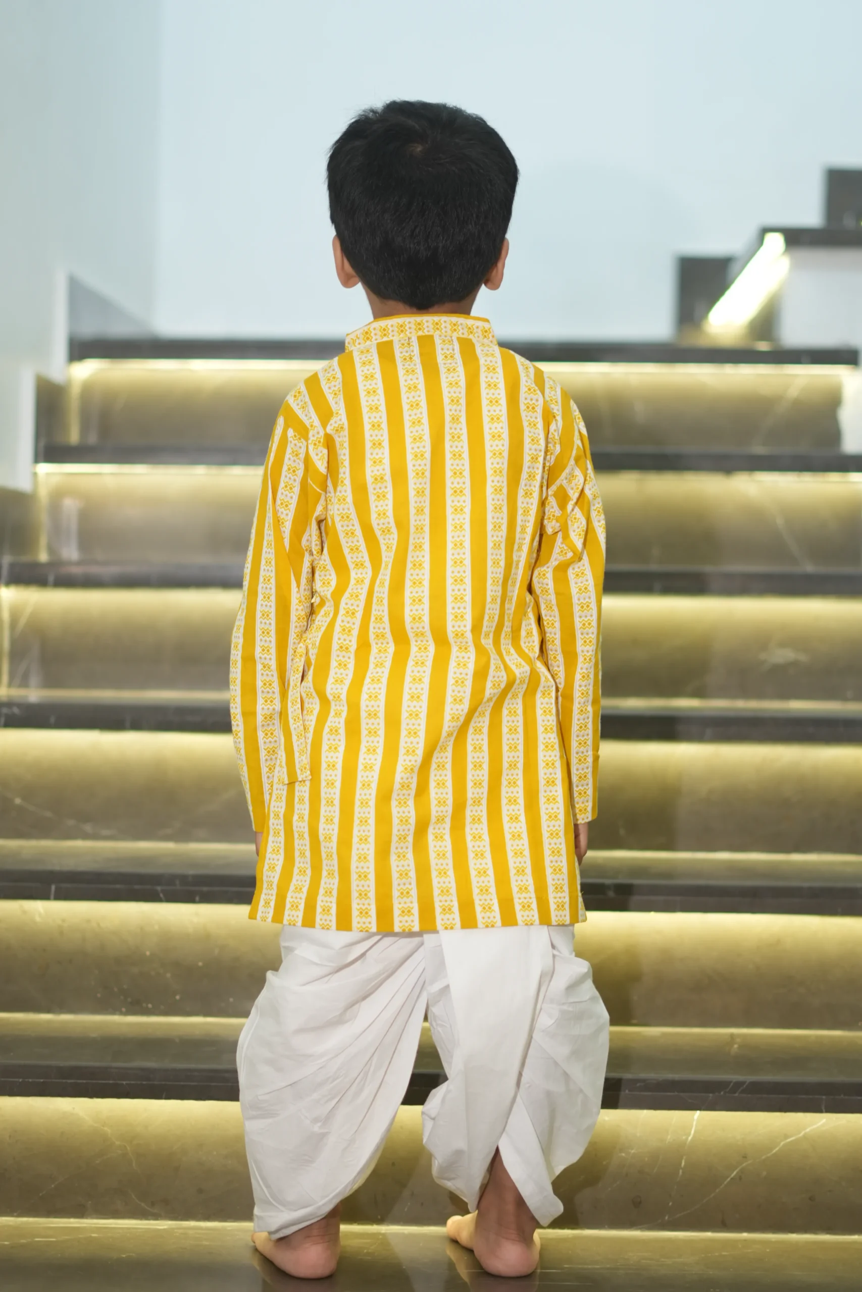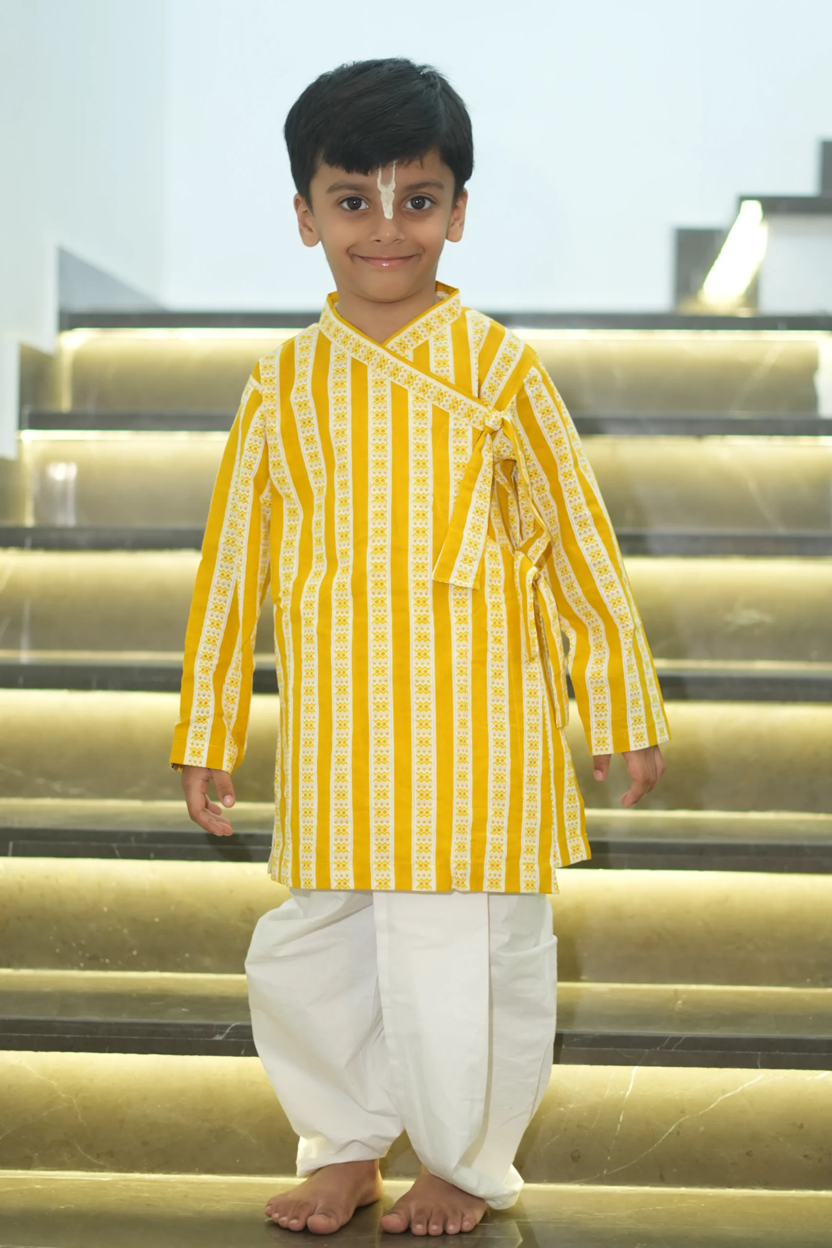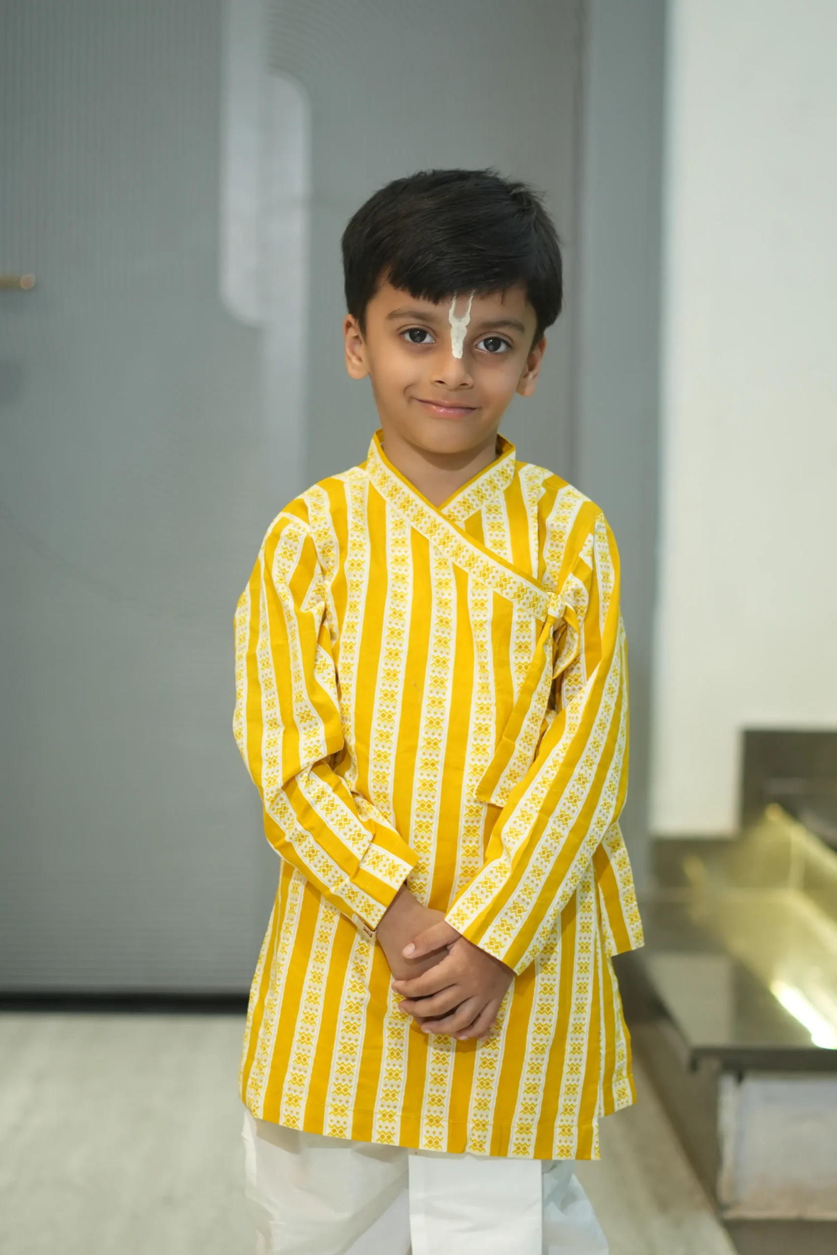 The Baal Leela Bagalbandhi Set captures the innocence and simplicity of traditional childhood dressing. Crafted in breathable cotton, this set features a classic bagalbandhi kurta paired with a soft dhoti, allowing ease of movement while maintaining a rooted, devotional aesthetic.
