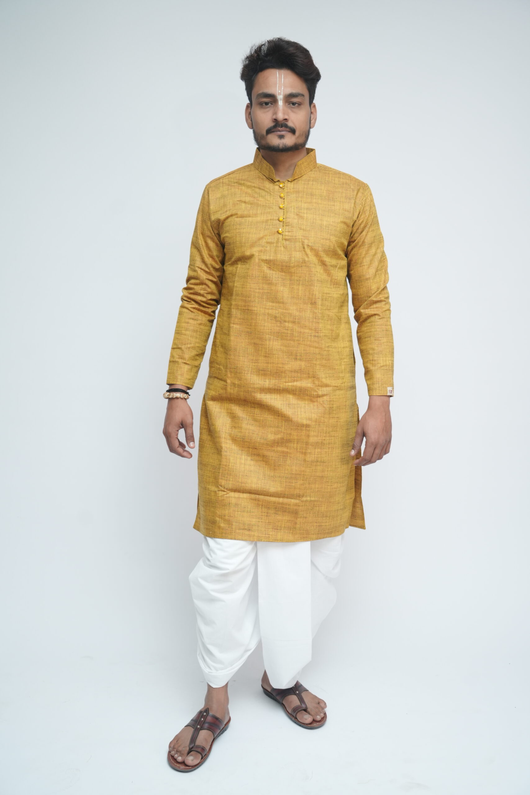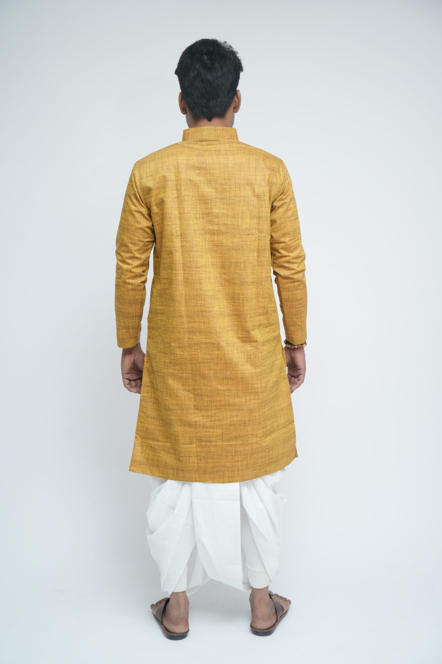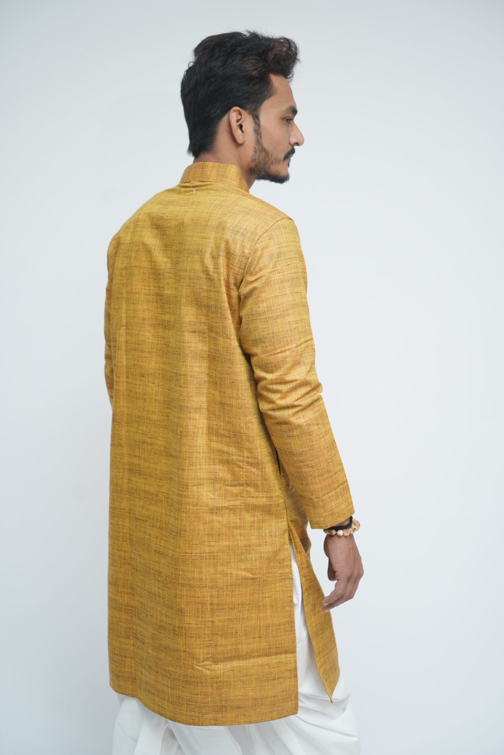 This kurta brings together two heritage fabrics — matka silk, known for its raw texture, and khadi, valued for its breathability and comfort. The blend creates a balanced fabric that feels grounded yet refined, suited for modern traditional wear.