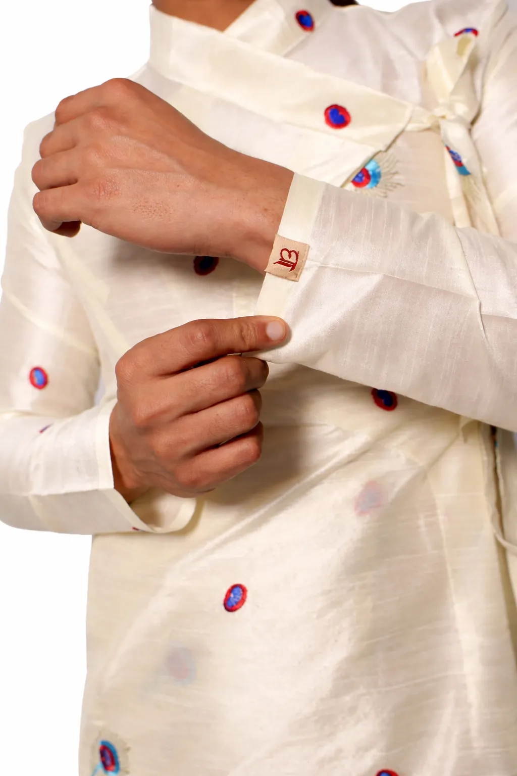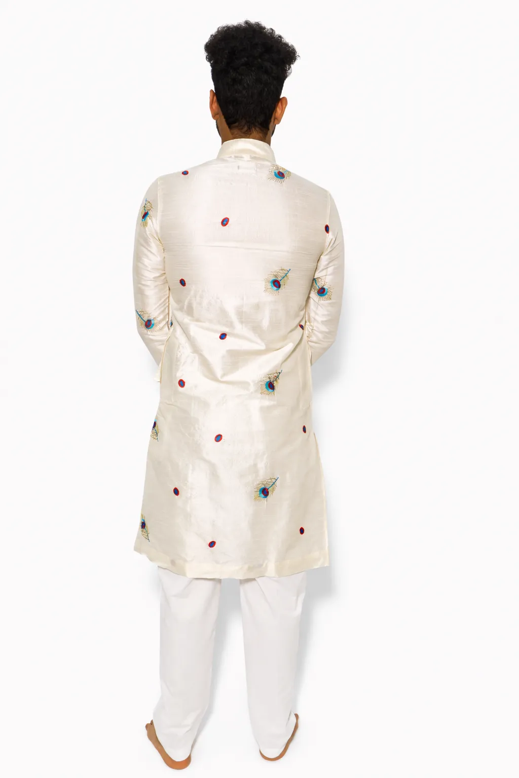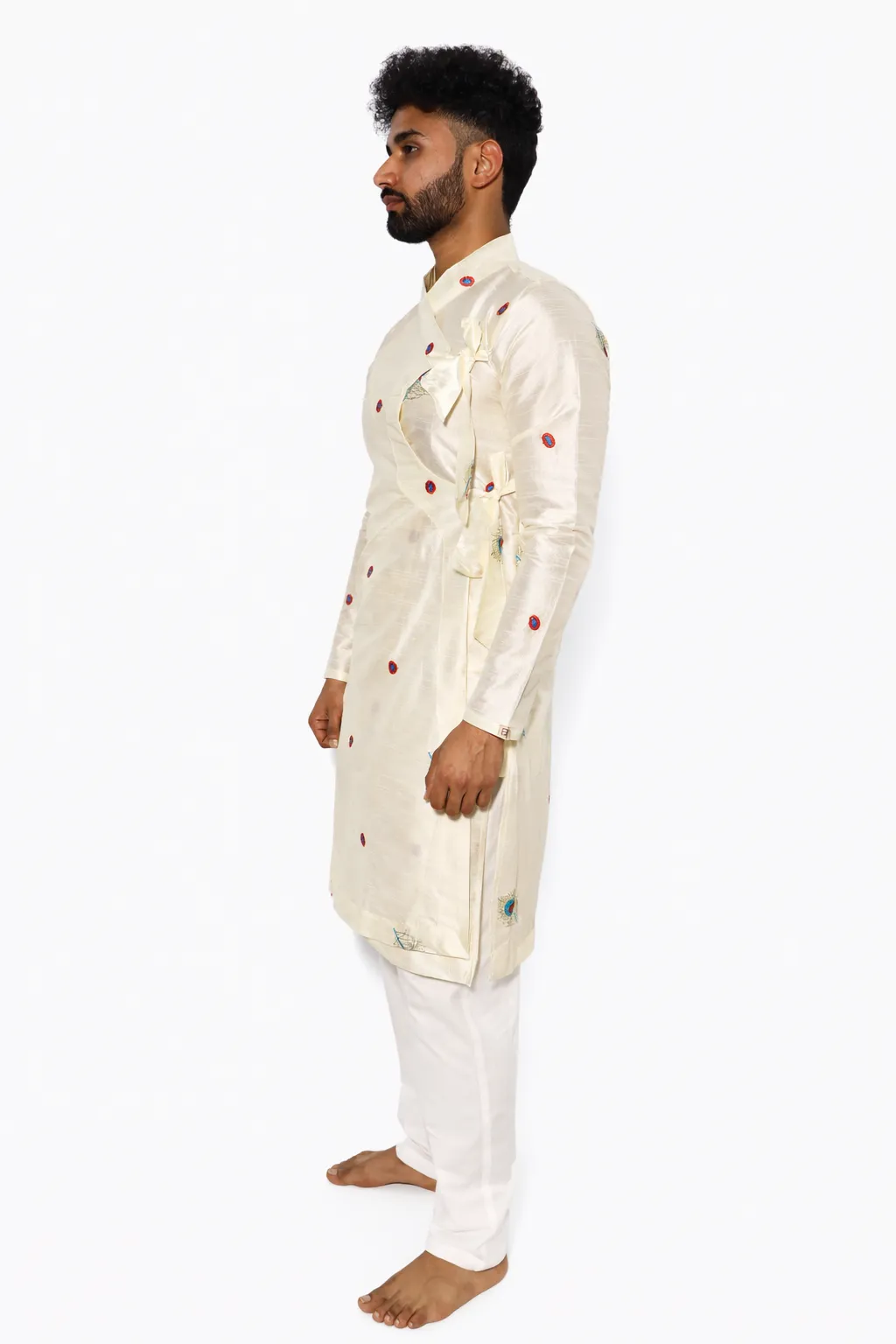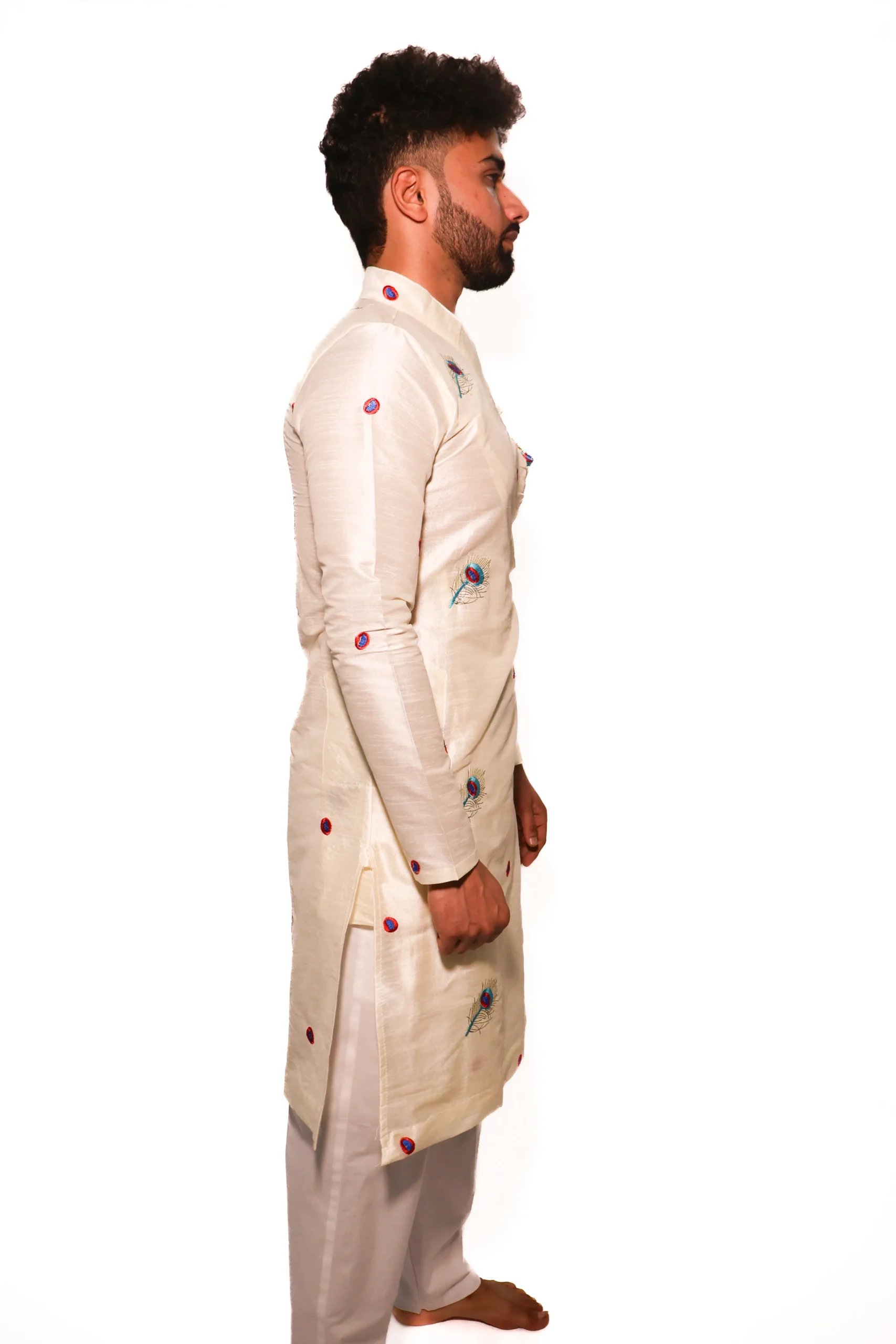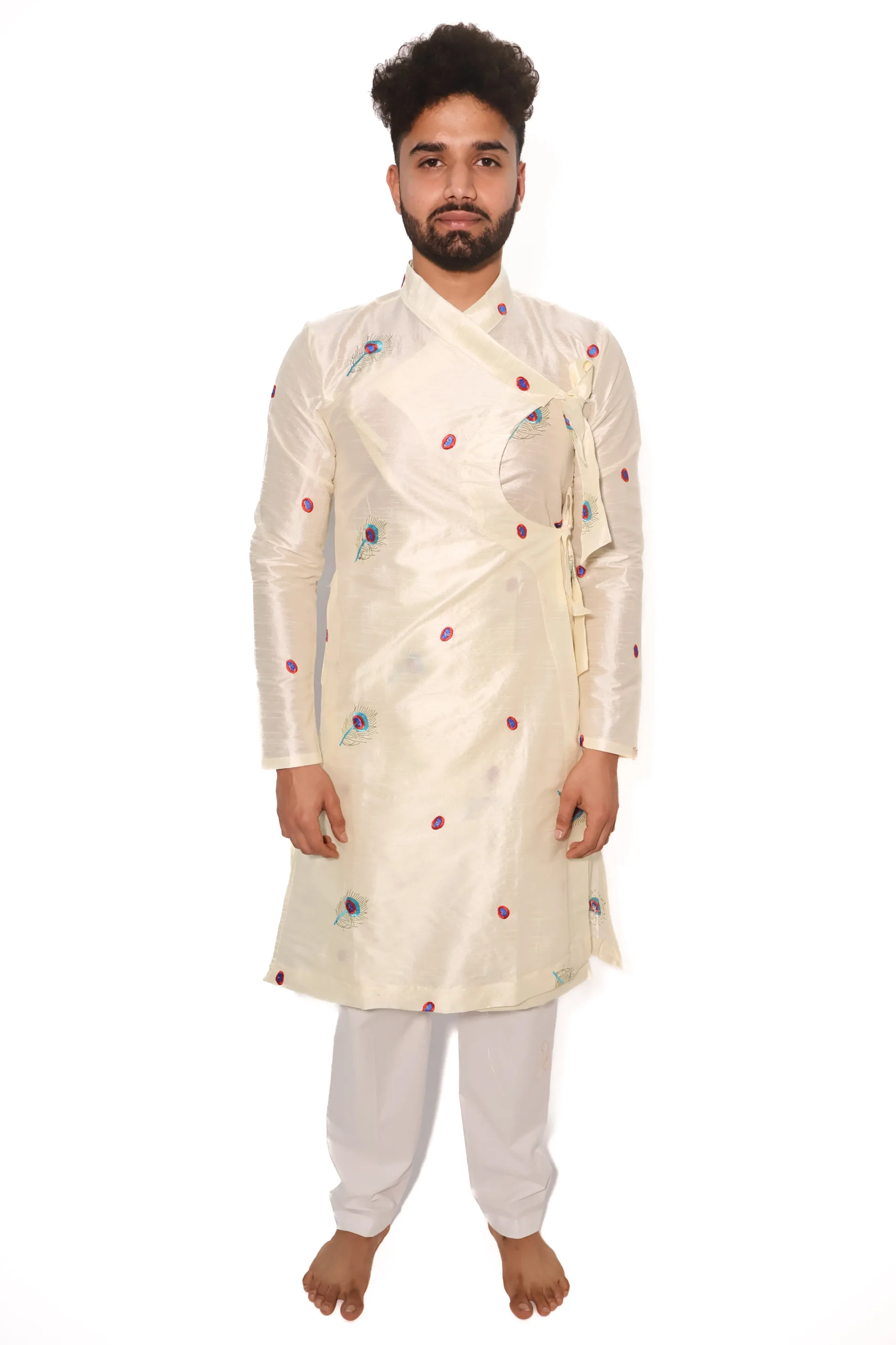 The Mor Pankh Bagalbandhi is crafted in silk, offering a soft sheen and smooth drape. The design is highlighted with subtle peacock feather embroidery placed across the garment, adding character without making it heavy. The classic bagalbandhi silhouette ensures a comfortable and balanced fit. Ideal for festive gatherings, cultural occasions, and light wedding functions, this piece reflects Dharniya’s approach to refined and wearable traditional clothing.