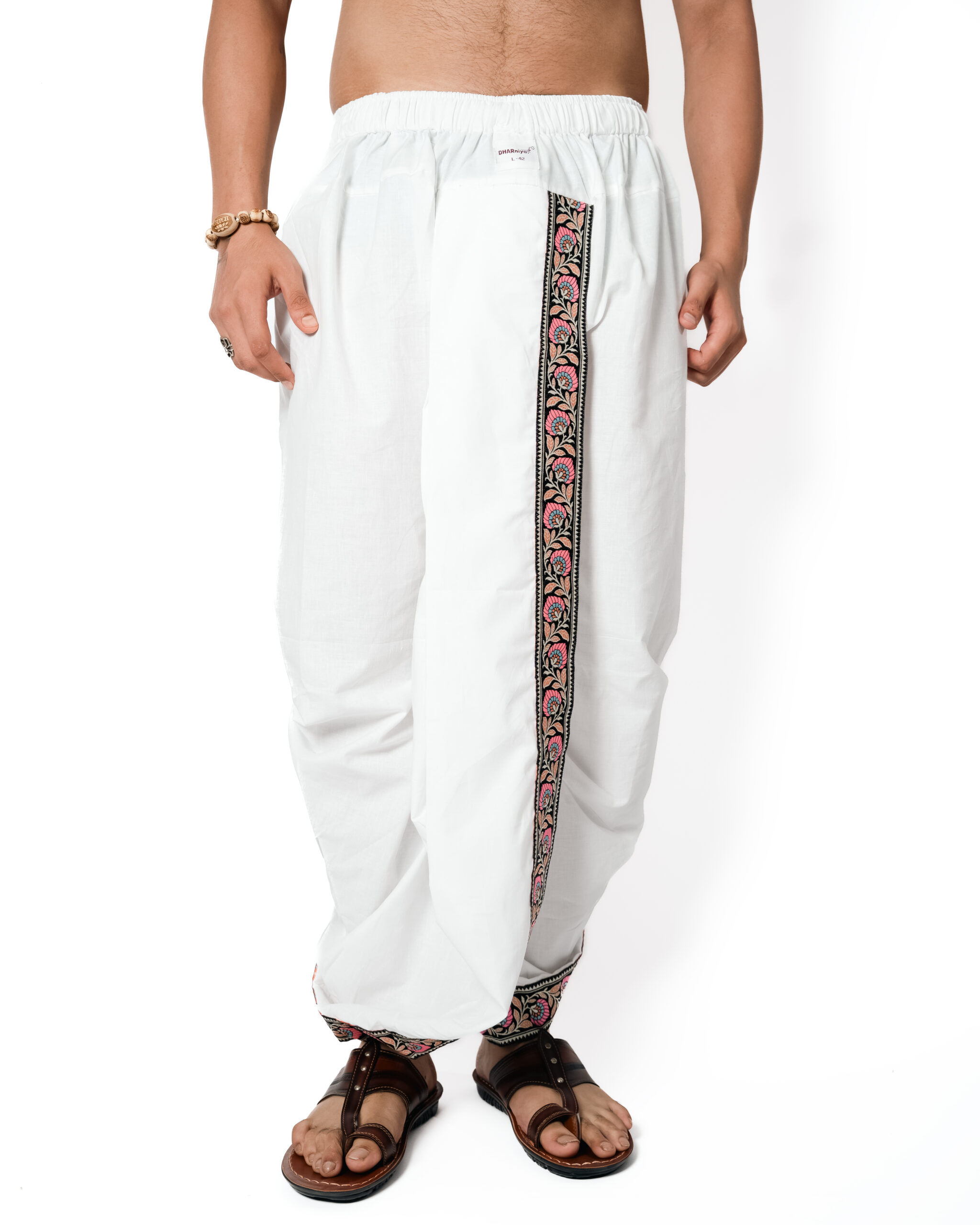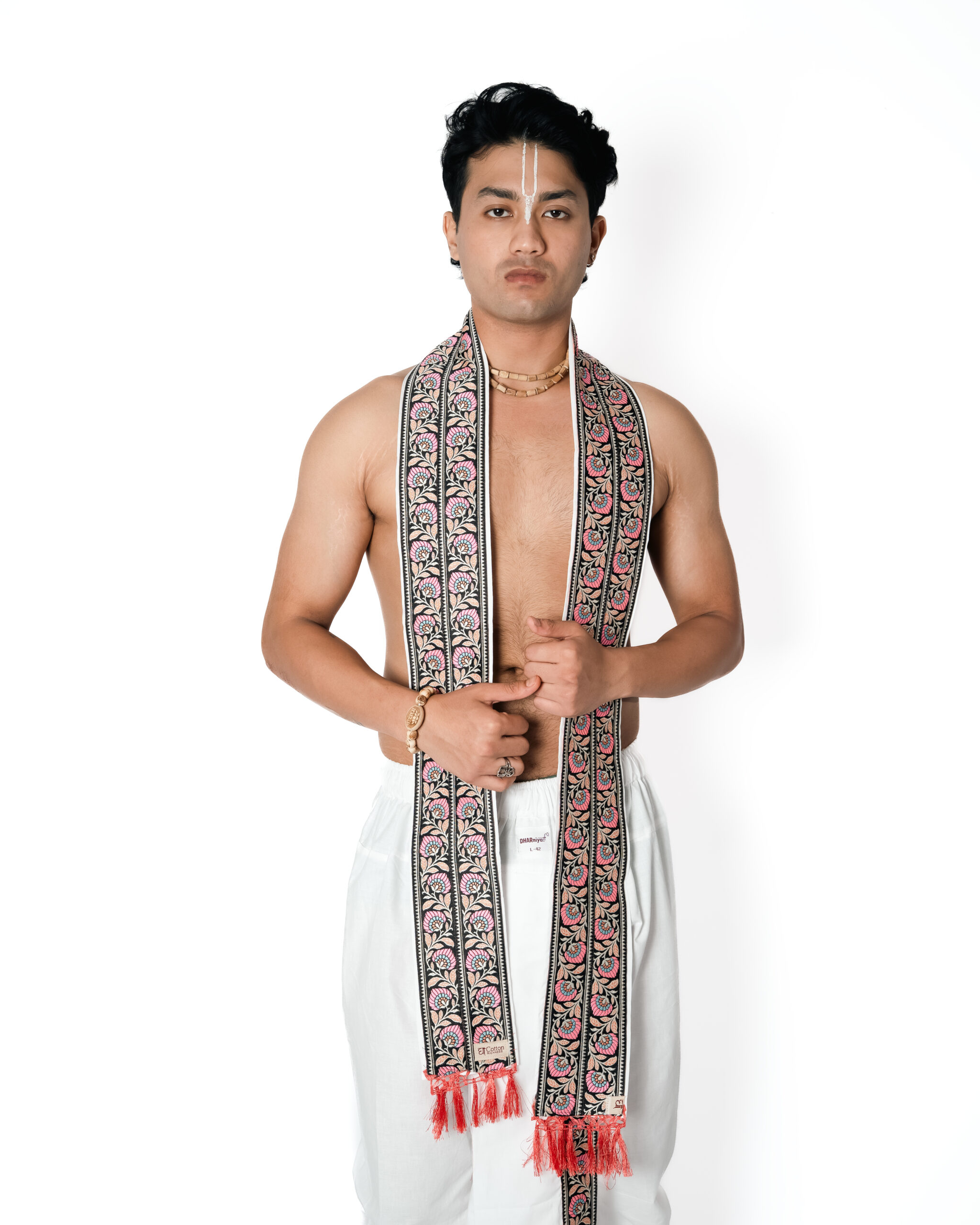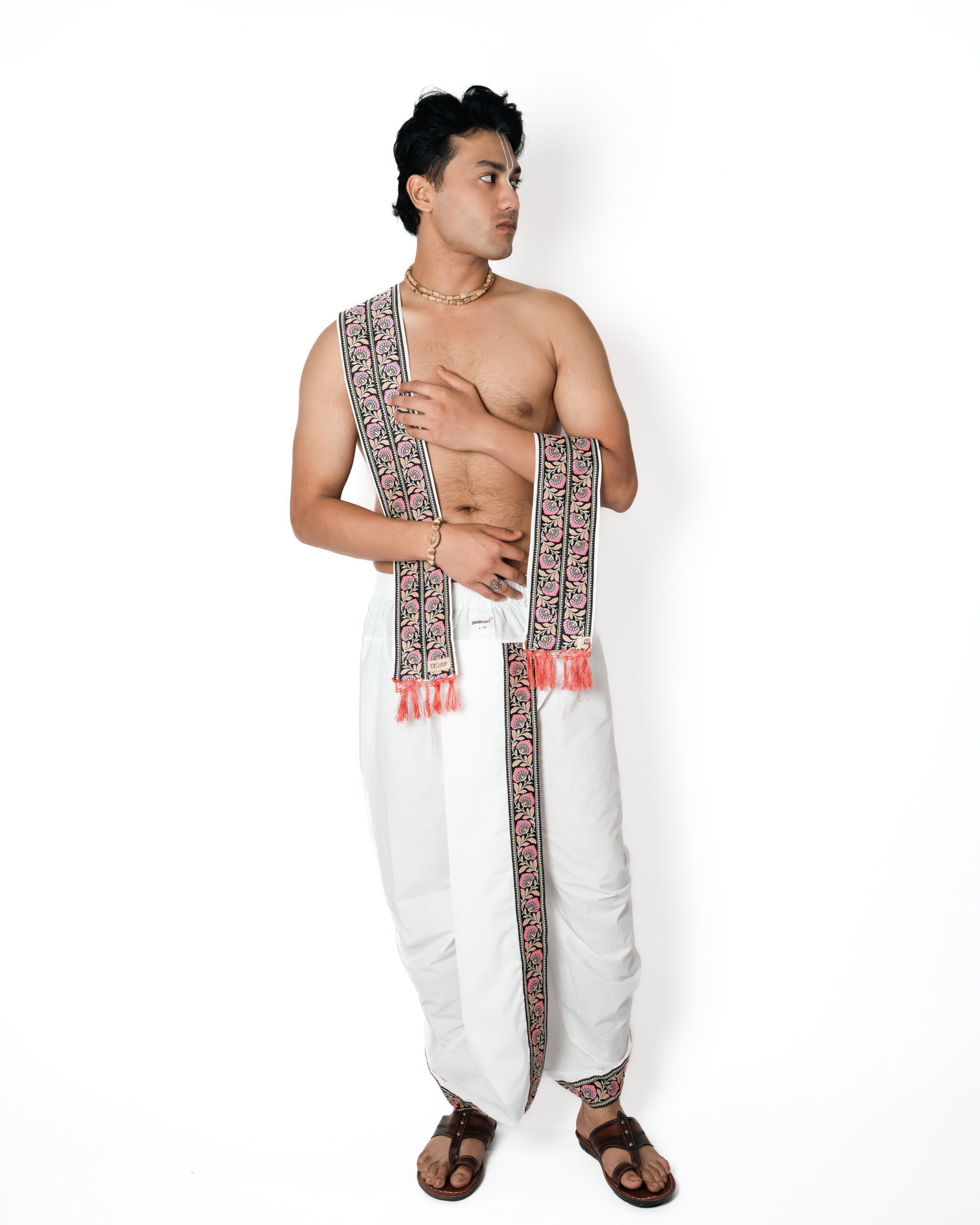 Includes: One Dhoti and One Patka. पुष्कर धोती और पटका सेट अपनी शुद्ध कॉटन बनावट और बारीक पुष्पाकृति बॉर्डर के साथ पवित्रता और भक्ति की झलक प्रस्तुत करता है। इसका मुलायम कपड़ा दिनभर का आराम देता है, और कारीगरी इसे विशेष बनाती है। पूजा, उत्सव या सांस्कृतिक आयोजनों के लिए यह एक उत्तम विकल्प है — धरणिया की उस सोच का प्रतीक जहाँ परंपरा ही सबसे सुंदर अलंकरण है।