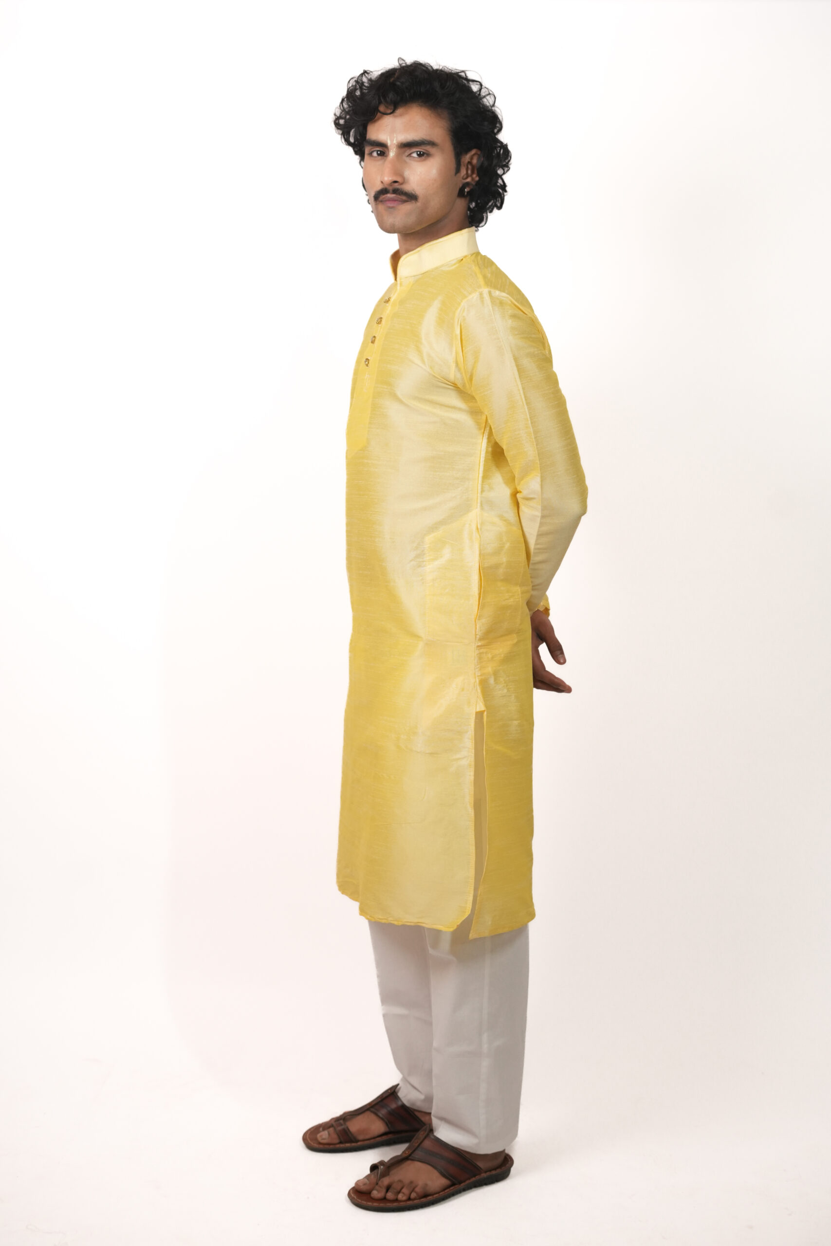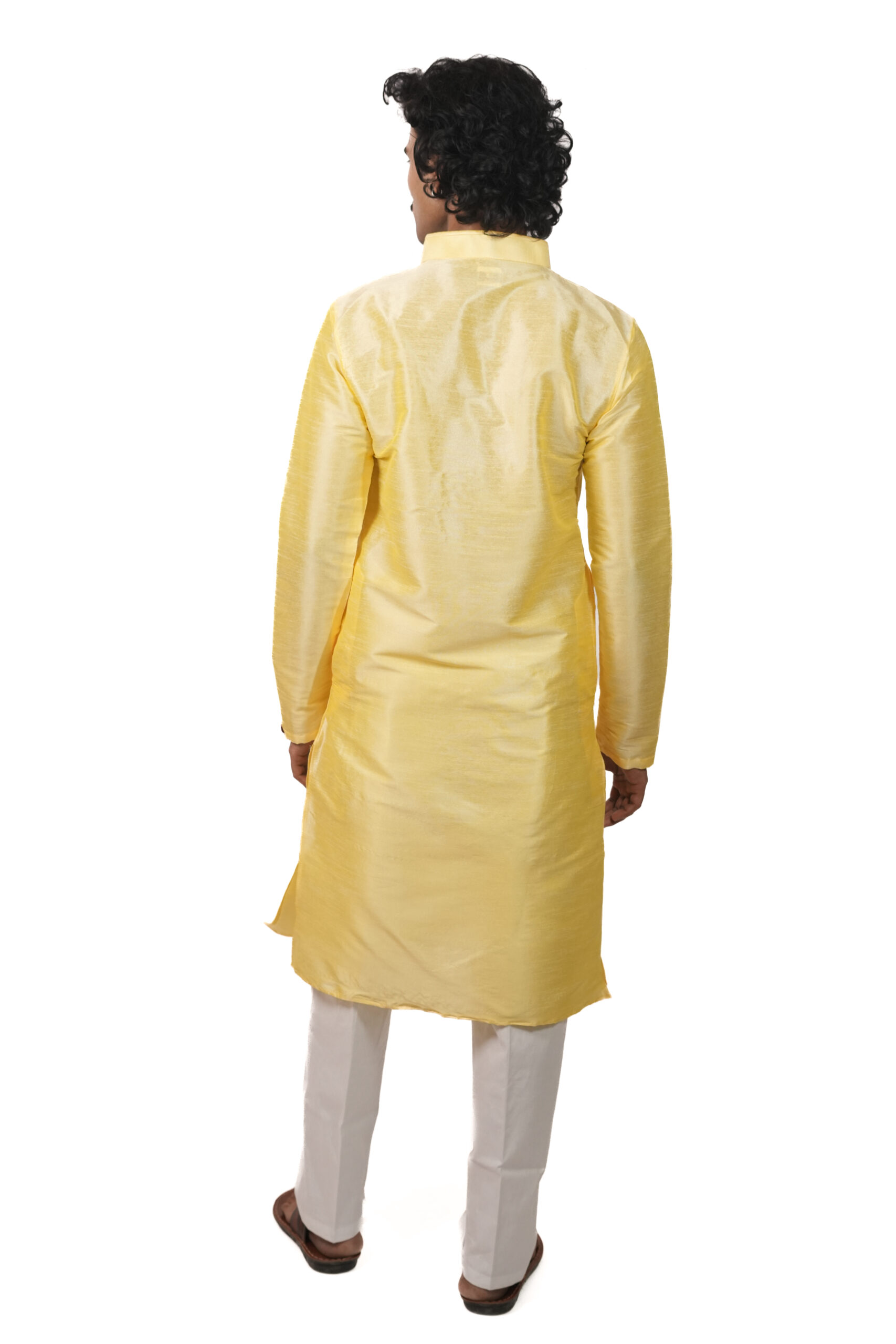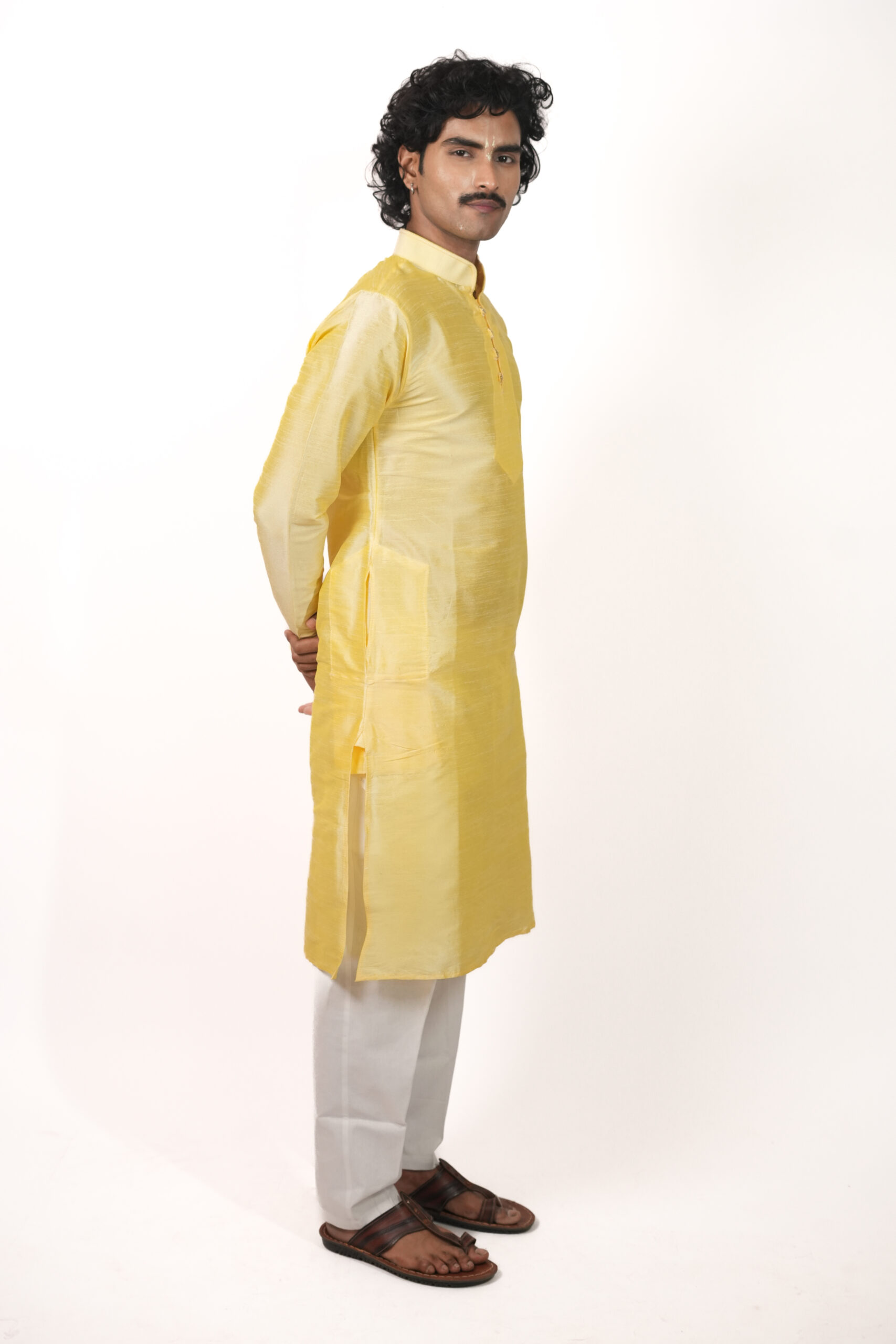 Crafted in dupion silk, the Raj Sutra Kurta brings together structure and subtle elegance. The defined neckline adds a refined character, while the natural sheen of the fabric enhances its festive appeal. The silhouette remains clean and minimal, allowing the richness of the material and finish to stand out. Ideal for daytime festivities and traditional gatherings, it reflects a composed yet radiant presence.