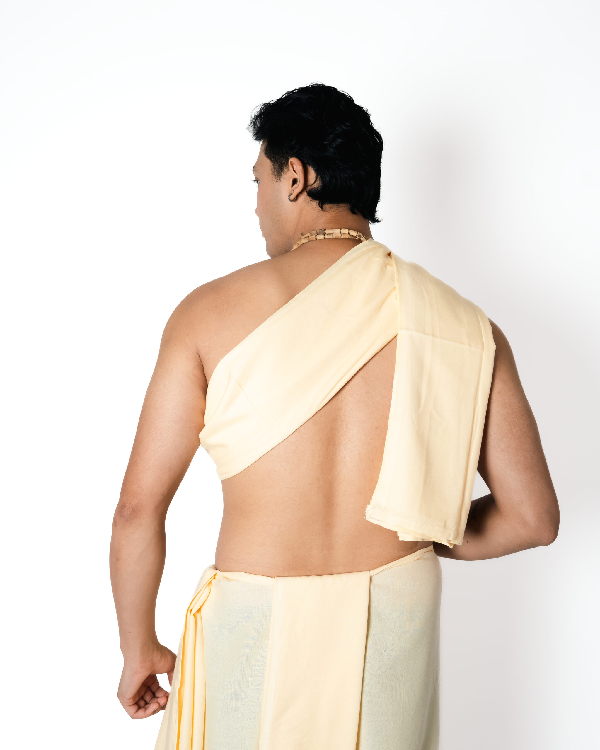बिना किसी अलंकरण या बॉर्डर के, इसका आकर्षण इसकी सादगी में है — ठीक वैसे ही जैसे साधु और योगी अपने वस्त्रों में आत्मिक संतुलन पाते हैं।