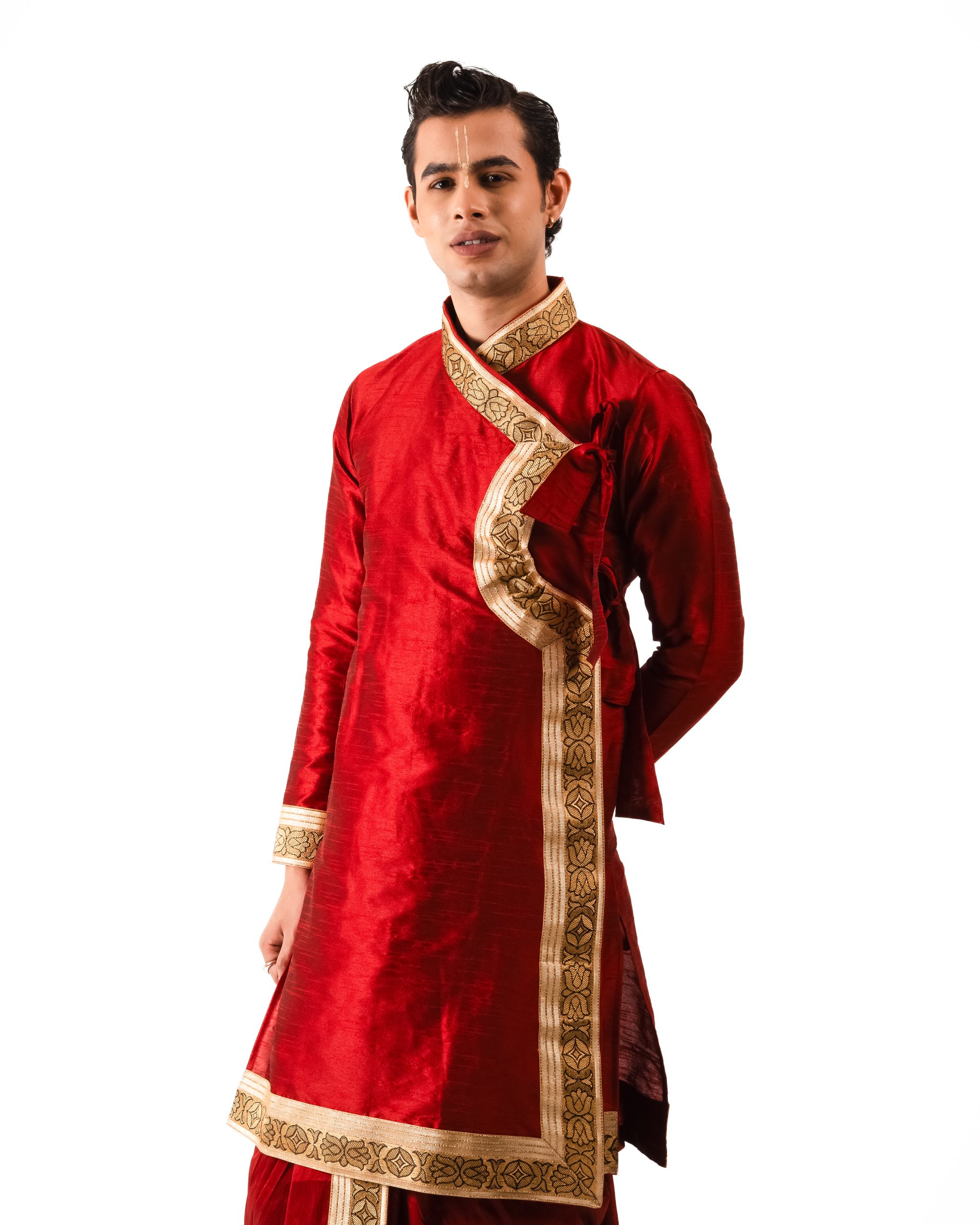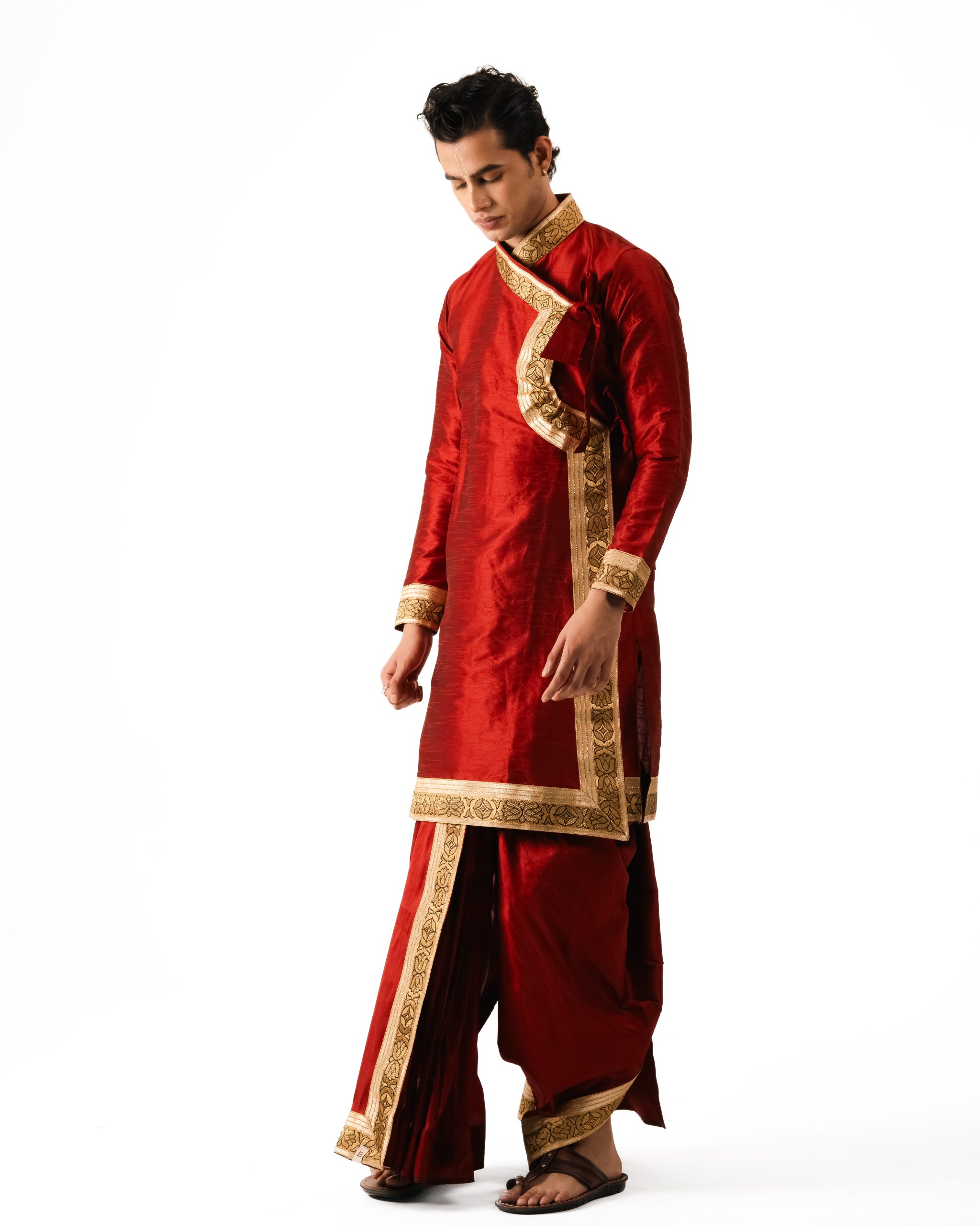 The Tamra Set elevates heritage and celebration with regal elegance. Crafted from luxurious Dupian silk, its soft sheen and maroon drape evoke prosperity and tradition, highlighted by an artisanal golden zari border for a touch of opulence. The three-piece set—dhoti, patka, and structured bagalbandhi top—blends classic Indian silhouettes with modern style, reflecting grandeur in both ceremonies and festive occasions.