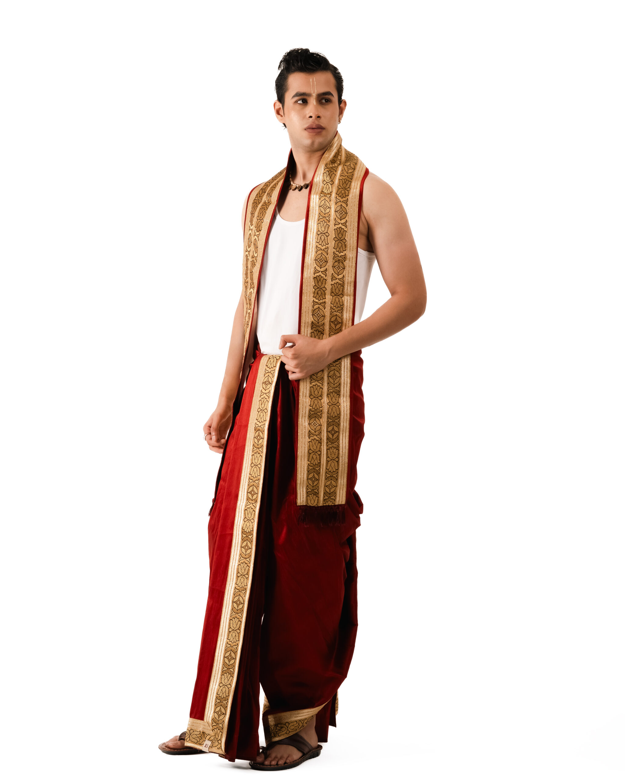 The Tamra Set (Dhoti + Patka) echoes regal elegance in every fold. Crafted from luxurious Dupian silk, the dhoti and patka offer a smooth, lustrous drape and exceptional comfort. The maroon hue reflects prosperity and tradition, enhanced with a handwoven golden zari border for a touch of subtle opulence. Perfect for festive gatherings, ceremonies, or heritage events, this ensemble is a seamless blend of tradition and contemporary grace, celebrating the artistry of Indian textiles and free movement.