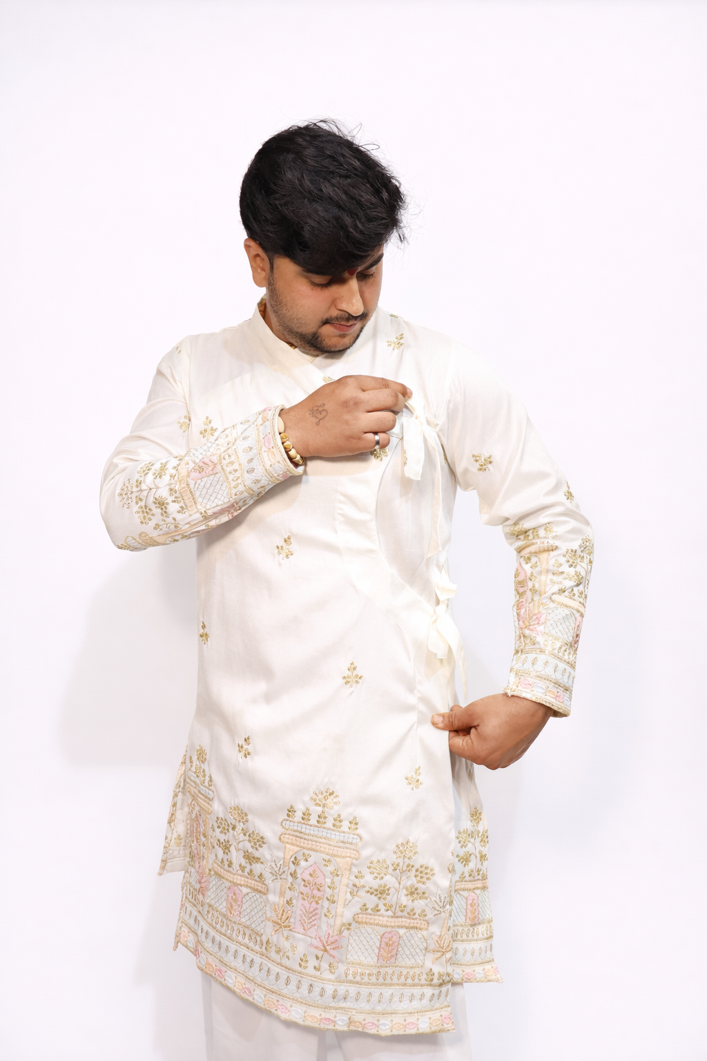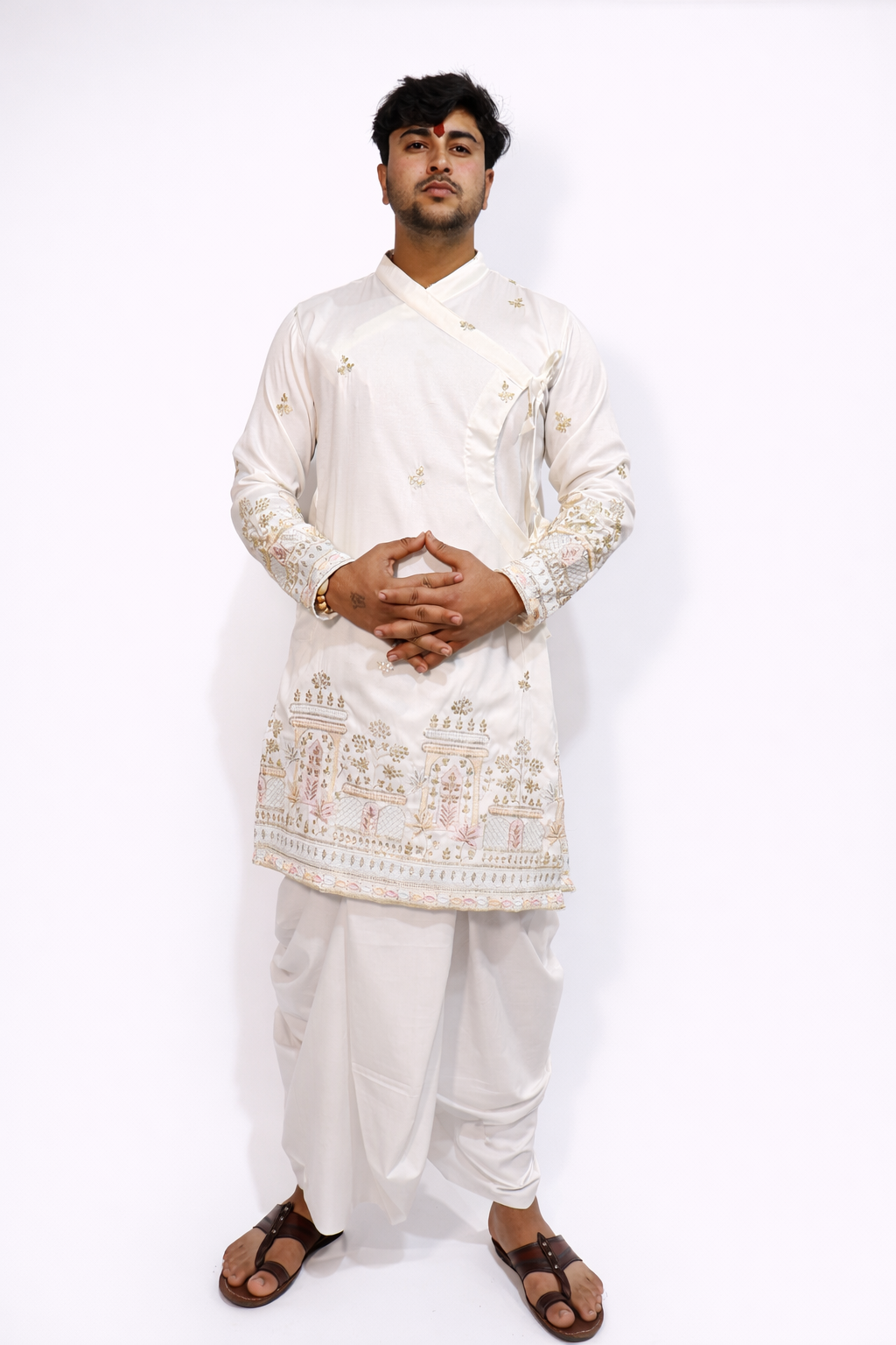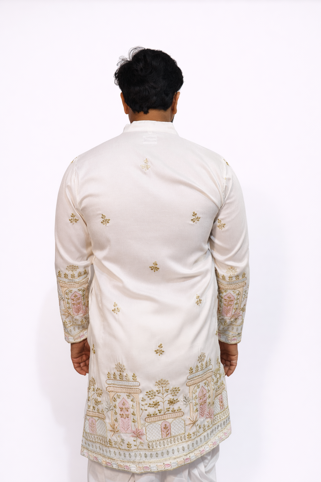 वनराज – राजद्वार एडिशन मुलायम साटन सिल्क में तैयार किया गया है| इसके बॉर्डर और आस्तीन पर राजसी द्वार और विरासत वास्तुकला से प्रेरित कढ़ाई की गई है। यह विवाह, उत्सव और विशेष पारंपरिक अवसरों के लिए उपयुक्त है।