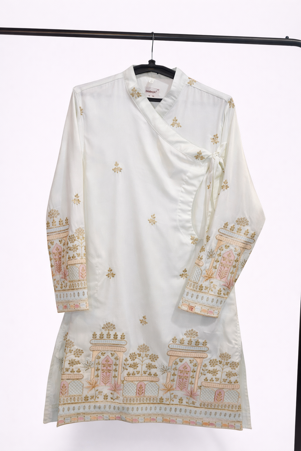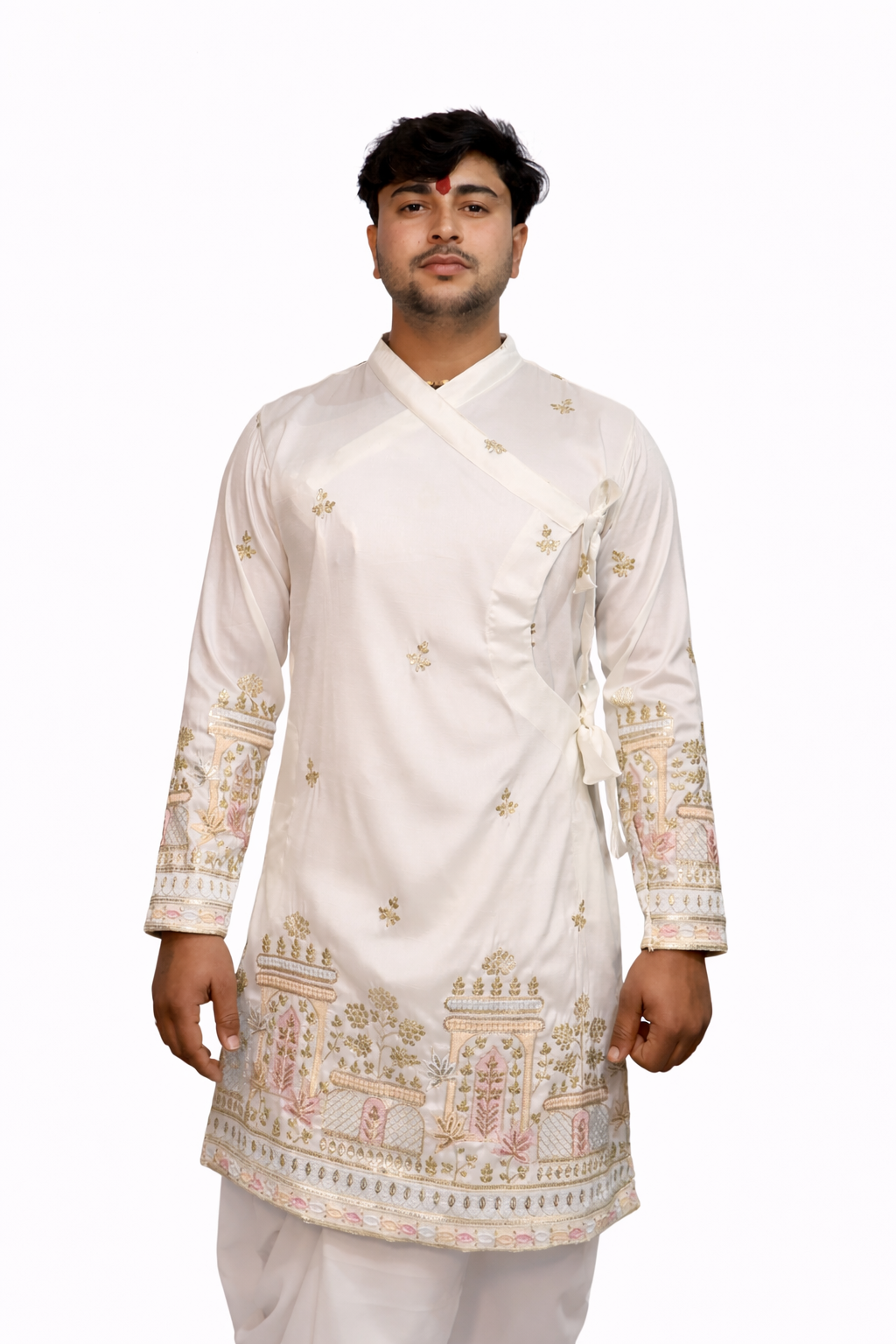 The Vanraj Bagalbandhi – Rajdwar Edition is made from smooth satin silk, offering a rich sheen and fluid drape. The silhouette is enhanced with detailed embroidery inspired by royal gateways and heritage architecture, placed thoughtfully along the hem and sleeves.Ideal for weddings, festive celebrations, and ceremonial occasions, this piece reflects Dharniya’s focus on heritage-inspired artistry with refined execution.