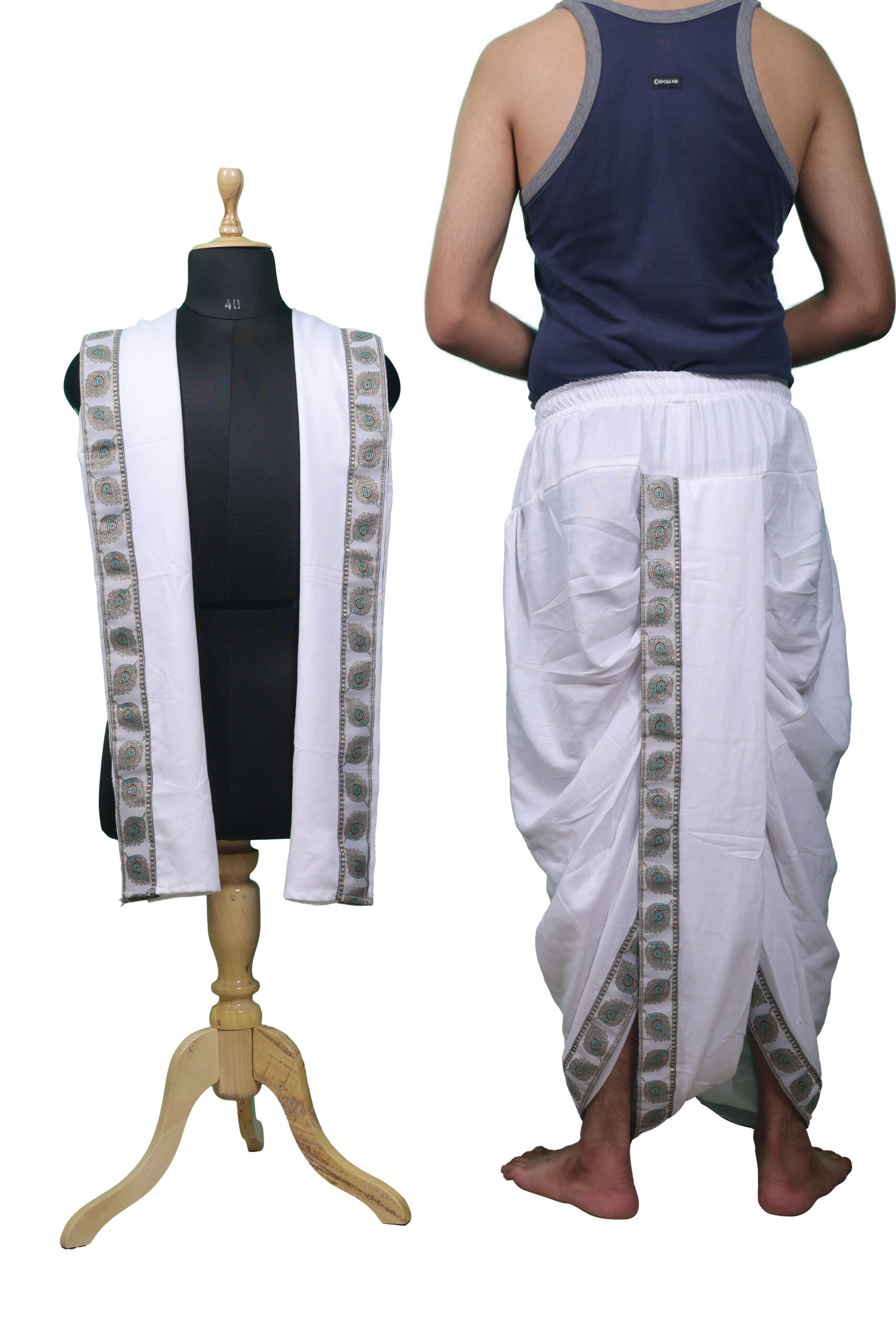 प्रीमियम भागलपुरी रेयॉन का धोती, दुपट्टा और बगलबंधी सेट, हाथ से बुने मोरपंख किनारों के साथ। हल्का, आरामदायक और पारंपरिक शिल्प का अद्वितीय संगम—त्योहारों और सांस्कृतिक समारोहों के लिए उत्तम।